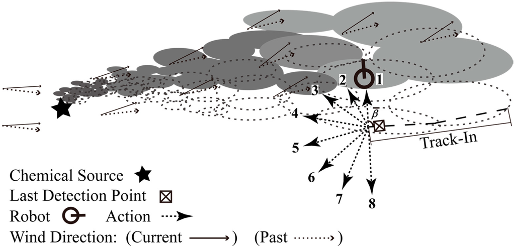 where denotes the number of actions. To avoid and equal zero and respectively, which in turn make the robot continue moving upwind in the Track-Out activity, is set as an even integer. Figure 3 illustrates the case that and equal and eight, respectively.