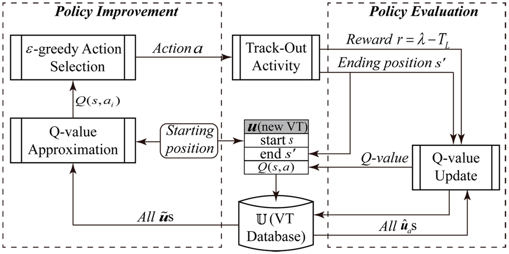 The process of policy evaluation includes the steps enclosed in the right dashed frame of Figure 4, which corresponds to lines 8–14 in Figure 5. When the Track-Out activity ends, policy evaluation process takes the end state and the time spent in the Track-Out activity (i.e., and ) as inputs, and outputs the updated Q-values of the conducted action and the VTs associated with .