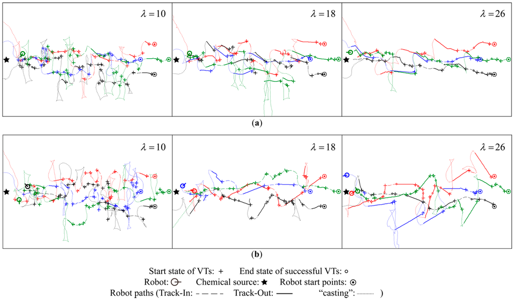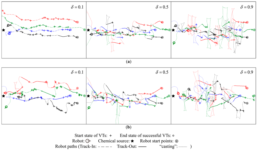 where was set to 0.5 [,]. Besides, due to the intermittent feature of real chemical plumes, short-term flashed non-detection events would occur when the robots get into the voids between chemical patches within the plume. Thus, to preclude this case, contact between the robot and plume was considered as lost after two consecutive non-detection events. In other words, the Track-Out activity was activated when equals three in our experiments.