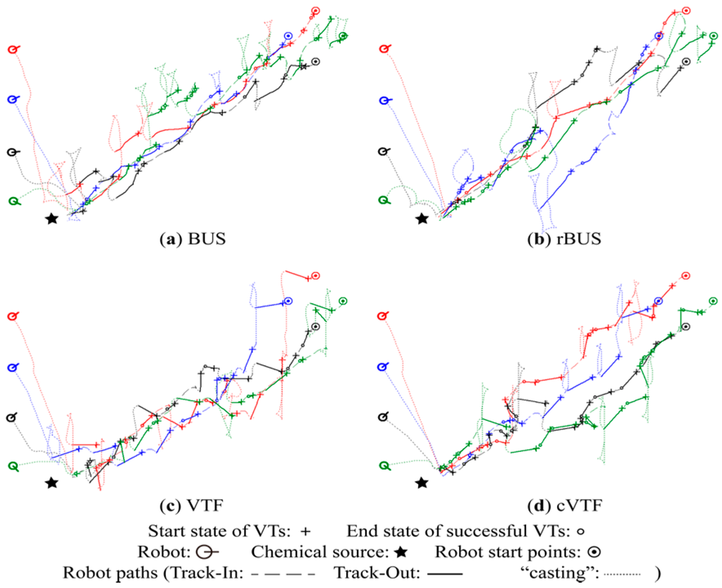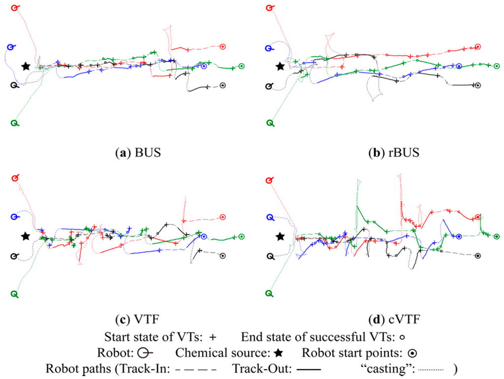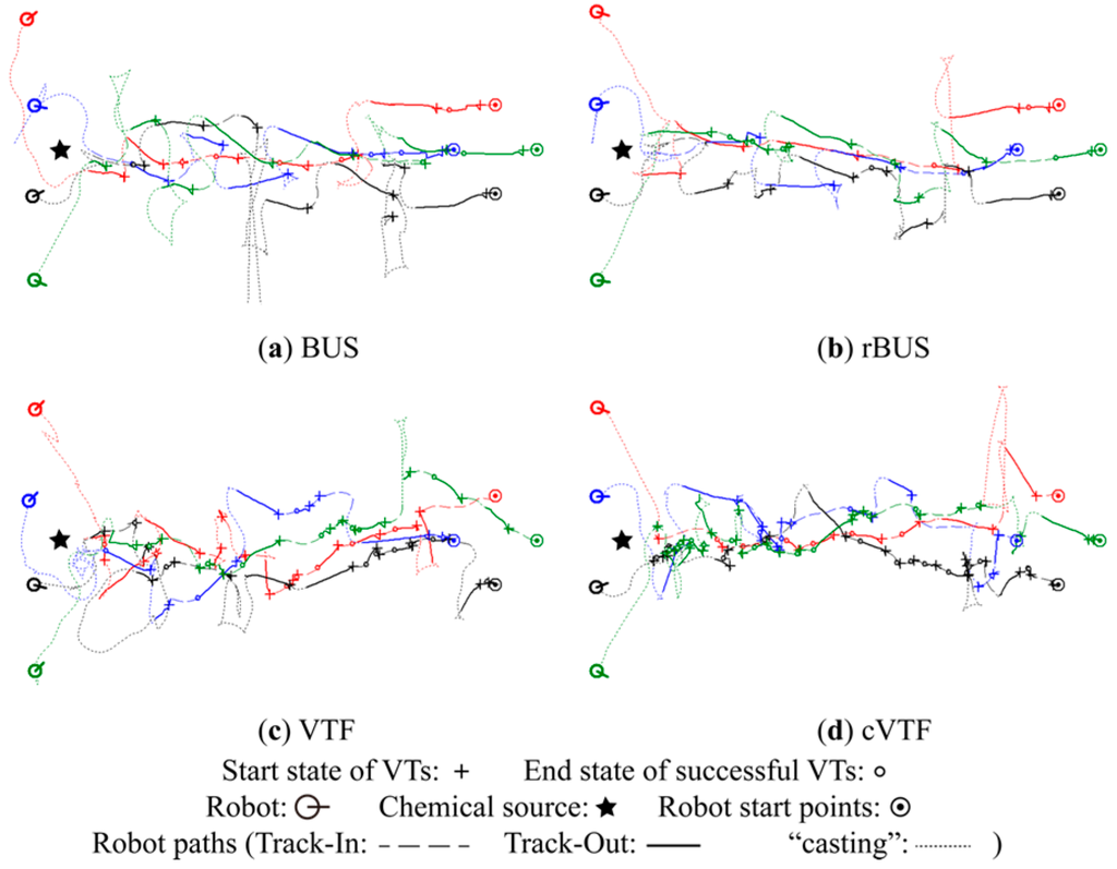 With respect to our experimental conditions, VTF and cVTF yielded generally higher success rates and time-efficiencies than BUS. VTF and cVTF realize online learning based on recently stored instances of successful Track-Out activities. In contrast, BUS utilizes an offline optimized bias angle through all Track-Out activities. Therefore, VTF and cVTF can adapt to different environments, while it is hard to optimize the bias angle beforehand for BUS with respect to all possible environments. Moreover, cVTF yielded higher success rates and time-efficiencies than VTF. Since there are more instances of rapidly succeeded Track-Out activities shared in cVTF than those maintained independently in VTF, cVTF yields higher probability of rapidly re-contacting the plume than VTF.