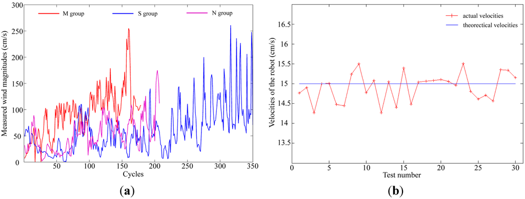 (a) Typical wind magnitudes measured in the three groups of experiments; (b) The robot’s actual velocities recorded in 30 tests.