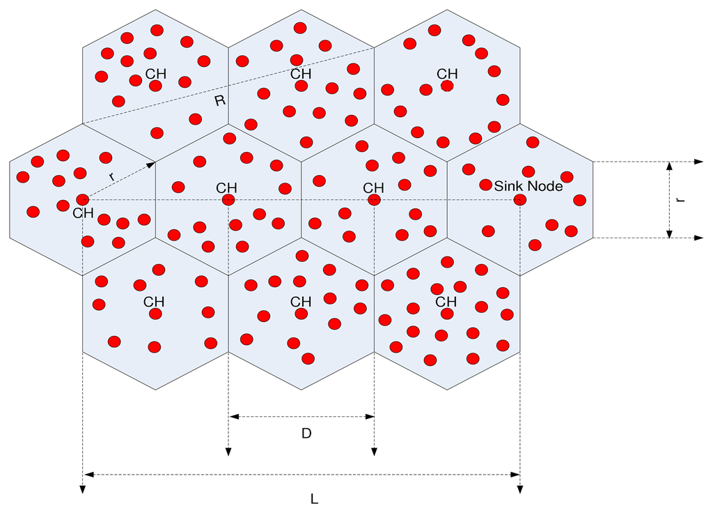 In an end-to-end multi-hop transmission considering an equal hexagonal cell, the best route between the source and the sink node is the direct line between them, where intermediate nodes are properly deployed (the nodes exists whenever needed). As shown in Figure 1, the data packet is transmitted from the source to the sink node, where L is the distance between them. Assuming that the distance between each CH is D, m is the number of CHs and is derived as: