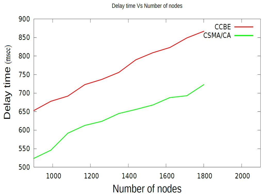 In order to understand the performance of the MAC scheme proposed in this paper, the time delay with increasing number of nodes in the sensor network is shown in Figure 10. It is clear that the delay increases with the increasing number of sensor nodes in the network. In CCBE for all values of the α MAC scheme is based on TDMA. Moreover, the number of slots required also increases. This results in increasing delay for end-to-end communication. In Figure 10, we have increased the number of CMs in each cluster from 10 to 20. Figure 10 compares the delay for both CCBE and CSMA/CA, which is used in LEACH and HEED. CSMA/CA has less delay due to the random access of the channel, and in CCBE, the nodes need to wait for their time slot for transmitting the data to other nodes. However, the energy consumed during the idle listening time for each sensor node in CCBE is decreased by letting those nodes sleep till it is time for the transmission or reception of packets. The number of clusters remained the same, even though the number of CMs is increased in each cluster.