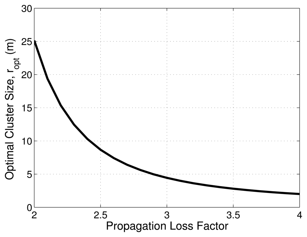By using correct transceiver parameters, Equation (11) shows the optimal CH location r, which depends on the propagation loss factor β with values ranging from two to four and with the network traffic, and the relationship between propagation loss factor β and r is shown in Figure 2. In Figure, the optimal CH distance and the side of the cell decrease when the propagation loss factor β increases, while network traffic N is constant. Furthermore, there is a trade-off between the number of CHs and the energy consumed in each CH. Based on Equation (8), when the number of CHs increases, the length of the side of the hexagonal cluster decreases, then energy consumption is dominated by the fixed energy consumption of each CH. When the number of CHs decreases, the length of the side of the hexagonal cluster increases, and energy consumption is dominated by the CH, because the energy consumed in the transmitter amplifier of each CH increases quickly.
