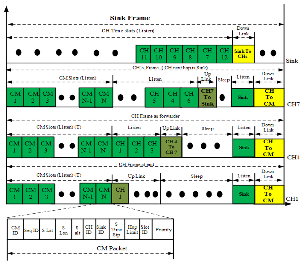 The frame of CH as a starter (CH1), forwarder (CH4) and CHs' next hop as the sink (CH7) are shown in Figure 3. CH1 represents the CH of the cluster at the extreme end. Moreover, CH1 is not required to listen to other CHs for forwarding information to the sink. The frame of CH1 is divided into five slots. These are for listening to the CM and sink transmission, transmitting data to its next hop CH and its CMs and the sleep state. The CHs assign the time slot to CMs based on their remaining energy. The CM with the least energy will be given the first slot to transmit to the CH. The CM goes to sleep after transmission and only wakes up to receive the data from the CH in the same frame. Then, next is the CH forwarding state to the next hop CH in the direction of the sink. The sleep states of each CH are varied depending on the location of the CHs. The CHs at the extreme end, such as CH1, have more sleeping time compared to the CHs near the sink.