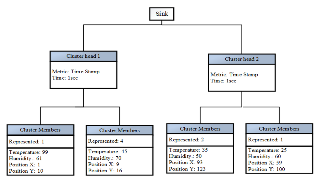 In research of data aggregation schemes, there are different methods of data aggregation based on tree- and cluster-based aggregation. The tiny aggregation service (TAG) algorithm [21] is based on a tree structure network, where the number of transmitted packets are decreased by data aggregation. Cluster-based aggregation is used to overcome the problem of transmission delay and the loss of data due to node failures in the route to the sink. The CH aggregates the information from CMs and performs the average, or minimum, or maximum aggregation function. Different cluster-based protocols are explored in [22]. In cluster-wide correlated grouping (CWCG) [23] hybrid structure for data aggregation is proposed, which uses the concept of the temporal and spatial grouping of nodes. It provides reduced transmission cost, but increases the latency. In adaptive data aggregation (ADA) [24], the temporal aggregation degree is controlled by the reporting frequency of the events at the sensor nodes, and the spatial degree of aggregation is set by the aggregation ratio at the CH. The sink has the central control for aggregating the data by sending the temporal and special degree. It provides improvement in the desired reliability compared to that observed.