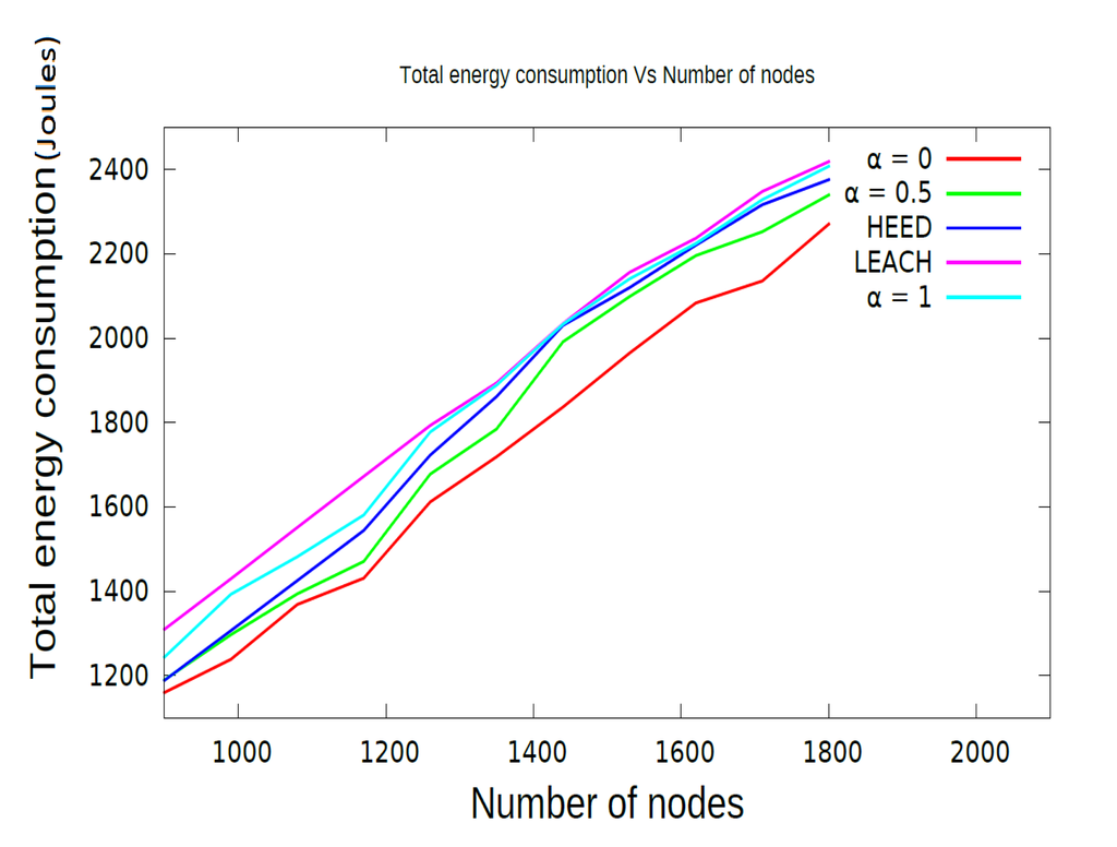 The first performance metric, energy consumption over time, gives an idea of the rate of consumption of energy in the network. The initial energy given to each sensor node is two Joules. Figure 5 shows the variation of energy consumption with respect to the increasing number of sensor nodes in the network. As shown in Figure 5, the proposed CCBE (α = 0) protocol consumes less energy compared to other protocols, CCBE (α = 0.5), CCBE (α = 1), LEACH and HEED, respectively. CCBE (α = 0) consumes 64% of the energy of the entire network before 30% of the network nodes die. The energy consumption in CCBE is reduced by allowing the sensor nodes to sleep between the time for transmission and reception of packets. The energy consumption increases according to the increasing number of sensor nodes in the network for all algorithms. Less energy consumption means more network lifetime. This is analyzed using the network lifetime Figures 6 and 7.