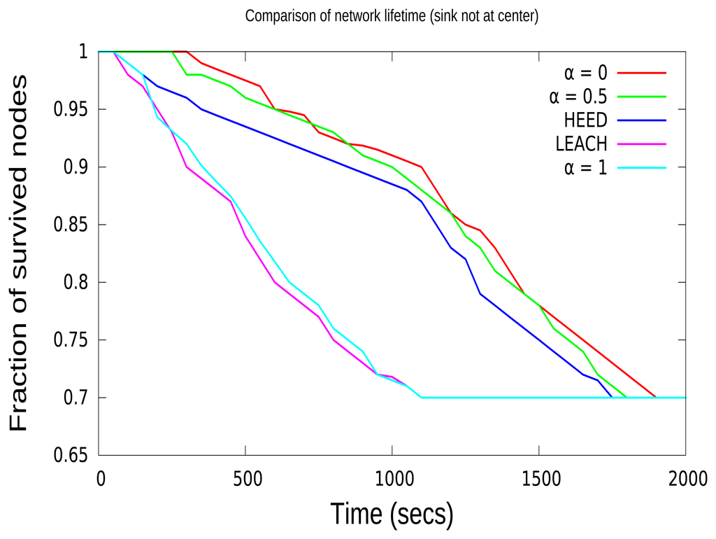 The network lifetime is defined as the fraction of nodes alive over time. This gives an idea of the time over which the network can send the data before all of the nodes in the network die. When α is set to the optimal value, it will prolong the network lifetime; for instance, when the definition of the lifetime of the network is 30% of nodes completely depleting their energy. Additionally, 30% of nodes referred to above corresponds to a 70% “fraction of survived nodes” in Figures 6 and 7. This 30% of nodes does not have enough energy to receive or transmit a packet. In Figure 6, the network lifetime based on various values of α from zero to one is shown, when the sink node is in the center. In both Figures 6 and 7, CCBE (α = 1) and LEACH, the network lifetime decreases drastically compared to the other algorithms. This is due to the fact that LEACH and CCBE (α = 1) do not take into consideration the residual energy of nodes during CH selection. This may result in selecting CHs with nodes having less energy. This may further affect the early depletion of energy for a particular node and the loss of packets. CCBE (α = 0) considers only residual energy during CH selection, which results in having the highest network lifetime compared to other protocols. In CCBE (α = 0), nodes with lower energy are never selected as CHs when the cluster contains nodes with higher residual energy. Moreover, this reduces the packet loss in end-to-end communications. Both the HEED and CCBE (α = 0.5) select CHs based on both residual energy and communication costs. This results in having a moderate network lifetime compared to other protocols. The network with the sink node in the center has more network lifetime due to the reduction of the number of packets that need to be aggregated and forwarded to the sink.