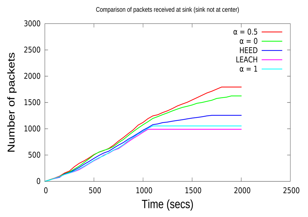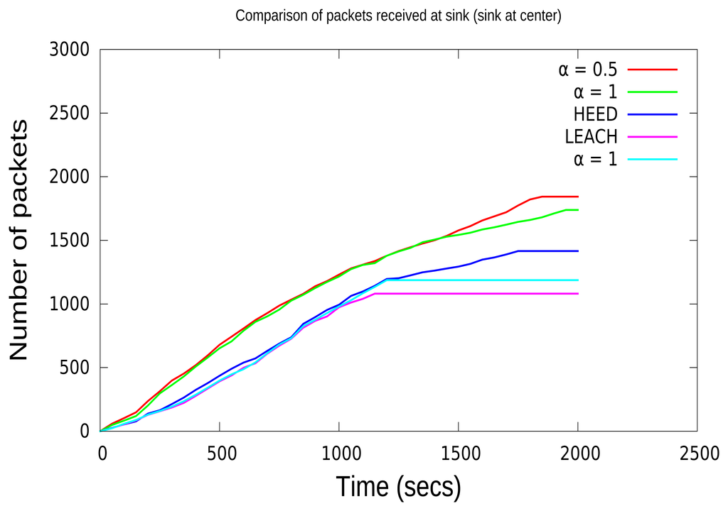 In order to analyze the effect of packet loss due to the selection of CHs with lower energy, in this paper, we have compared the number of packets received at the sink for various protocols. From Figures 8 and 9, it is clear that when the sink node is in the center, it receives a higher number of packets compared to the sink that is not in the center. Figures 8 and 9 show that before the network disconnection, the sink node of the CCBE (α = 0.5) algorithm receives much more data packets than the other algorithms. In Figure 9, the received data with CCBE (α = 0.5, 0) increase more quickly than the other protocols. Moreover, this is a result of using residual energy and the communication lost for CH selection. The number of packets received is shown in Tables 3 and 4 for both locations of the sink node. The sink node in the center for CCBE (α = 0.5) reduces the number of extra data transmissions from the CH to the sink node, thereby resulting in having a higher number of data packets received at the sink node.