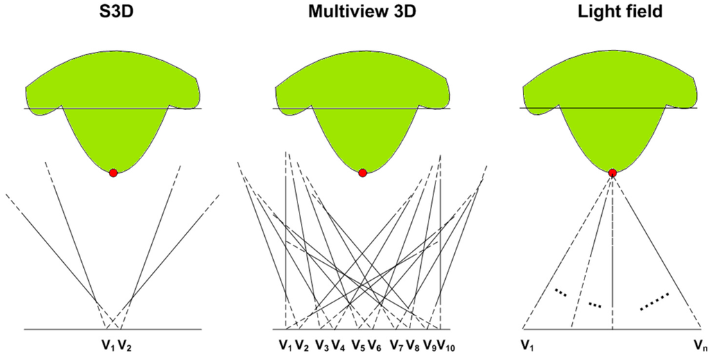 As shown in Figure 1, consider a sample scene (shown in green) and a point in the scene (shown in red). From the rendering aspect, the major difference is that S3D and multiview rendering do not consider the positions of 3D scene points. Therefore we have only two perspectives of a given scene on a S3D display and multiple but a still limited number of perspectives on a multiview 3D display. In both the cases, all perspectives are actually 2D projections of the 3D image, which collectively define the scene. Light field displays in contrast define the scene using directional light beams emitted from the scene points. Thus each scene point is rendered differently from other scene points resulting in more realistic and accurate 3D visualization.