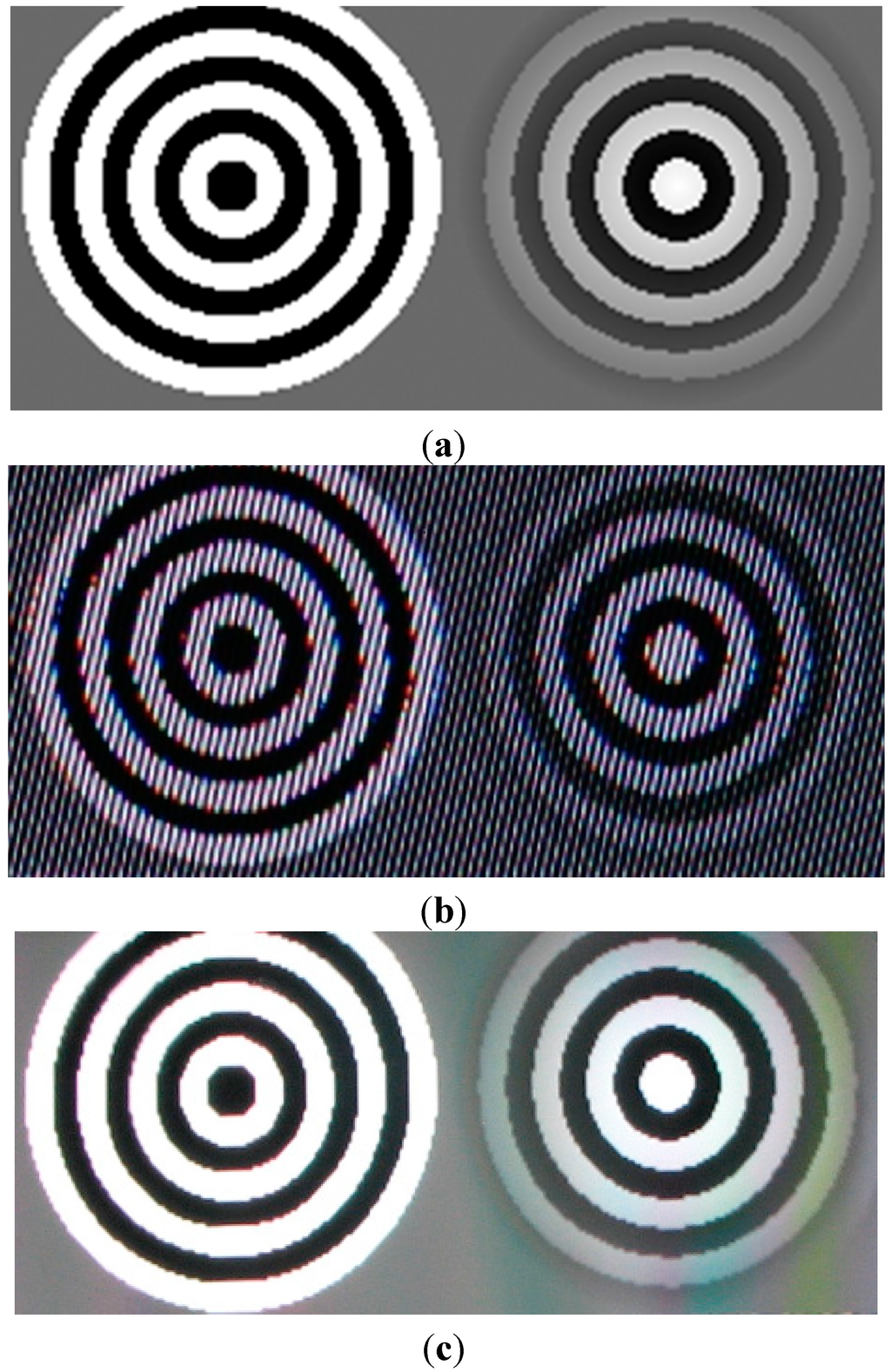 A direct advantage of light field displays can be clearly observed from Figure 2. Figure 2a shows two patterns of concentric circles lying in a plane. Figure 2b shows the screen shot of the patterns visualized on a barrier based multiview autostereoscopic display while Figure 2c shows the screen shot of a light field display.