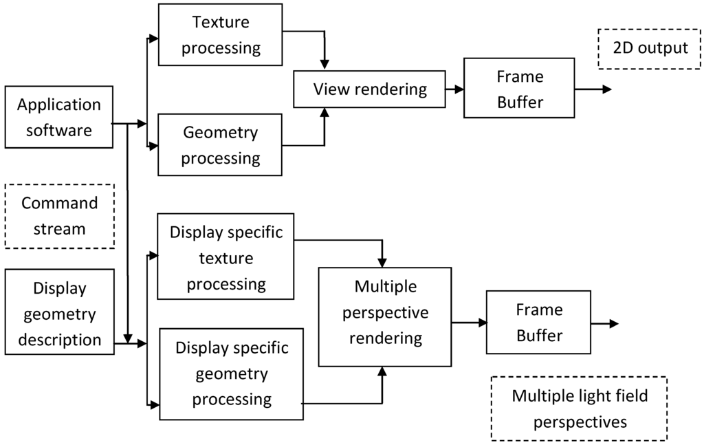Light field rendering from OpenGL command stream: the various commands from application software are modified in real-time using the display geometry description. Geometry and texture information is modified and processed to render multi-perspective light field.