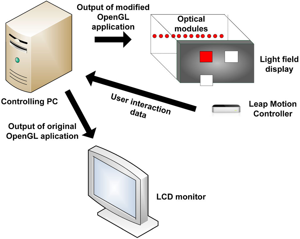 Experimental setup: The controlling PC runs two applications: main OpenGL frontend rendering application for 2D LCD display and backend wrapper application that tracks the commands in current instance of OpenGL (front end application) and generates modified stream for light field rendering. The front end rendering application also receives and processes user interaction commands from Leap Motion Controller in real-time.