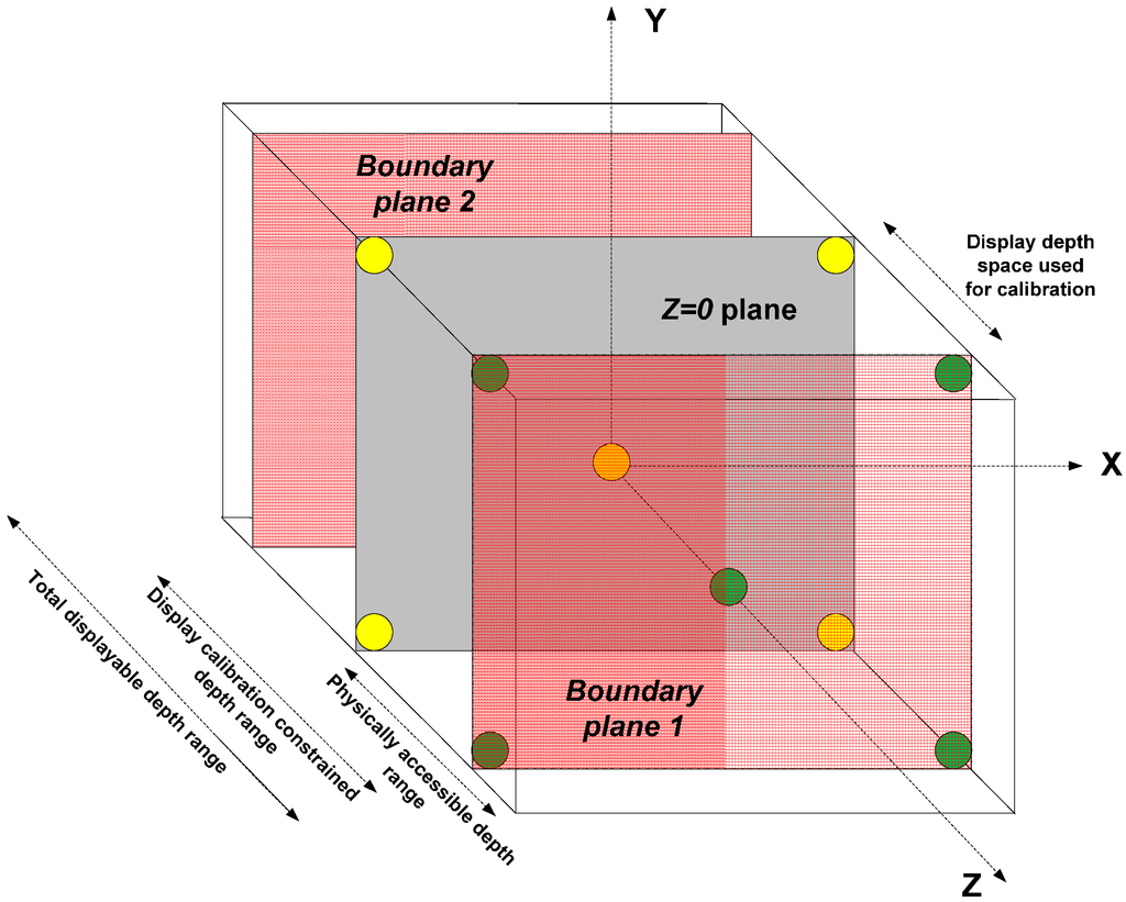 To minimize the error resulting from the non-uniform spatial resolution and calibration accuracy, we limit the total available depth range of the display for this experiment. We define two boundary planes within the total displayable depth range where the apparent spatial resolution and calibration accuracy is almost the same as on the screen (see Figure 8). This is done by measuring the size of a single pixel at various depths and comparing it with the size of the pixel on the screen plane (for information on pixel size calculation, please refer to [27]). Markers are drawn on the surfaces of the screen plane and on the physically accessible boundary plane and their positions in the display space and Leap Motion Controller space are recorded simultaneously. The calibration should produce a transform Ω between the two coordinate systems that minimizes the sum of Euclidean distances between the original and projected points when the set of all 3D points in one system is transformed to another.