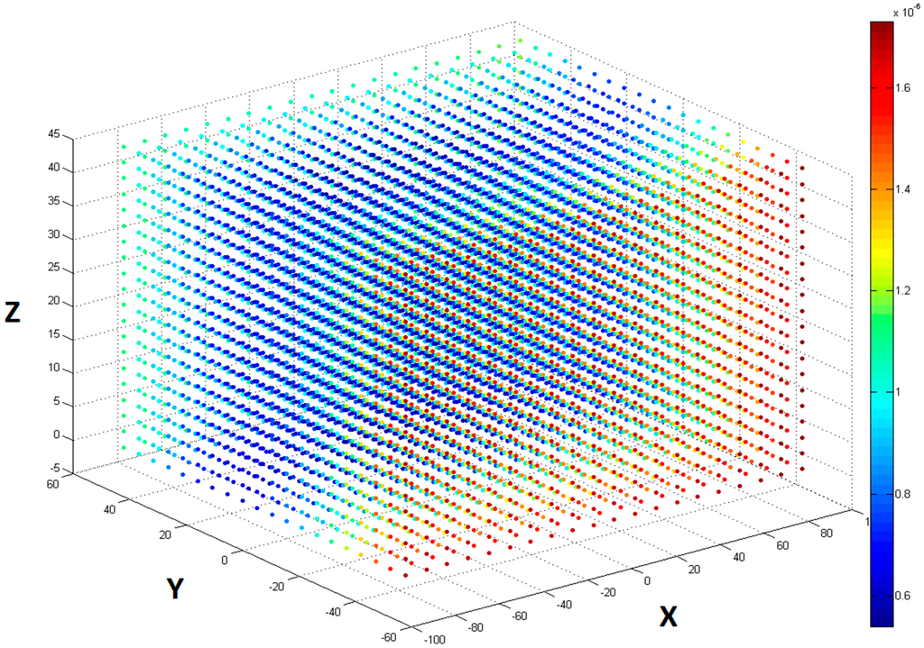 In order to quantify the calibration results accuracy, we sample the Leap Motion Controller space uniformly with 20 samples along each dimension (8000 samples in total). The distance between adjacent samples is 9 mm in the horizontal direction and 5 mm in the vertical direction. We project these samples individually on to the display space using the calculated transform Ω and record the Euclidean distance between the original and projected point. Figure 9 shows the projection errors made at various positions on a uniform grid by a sample calibration process. As we can see from the figure, the calibration error is less than 1 μm in most of the places. This is negligible compared to human finger tremor (the order of magnitude of a millimeter) or even Controller’s accuracy.