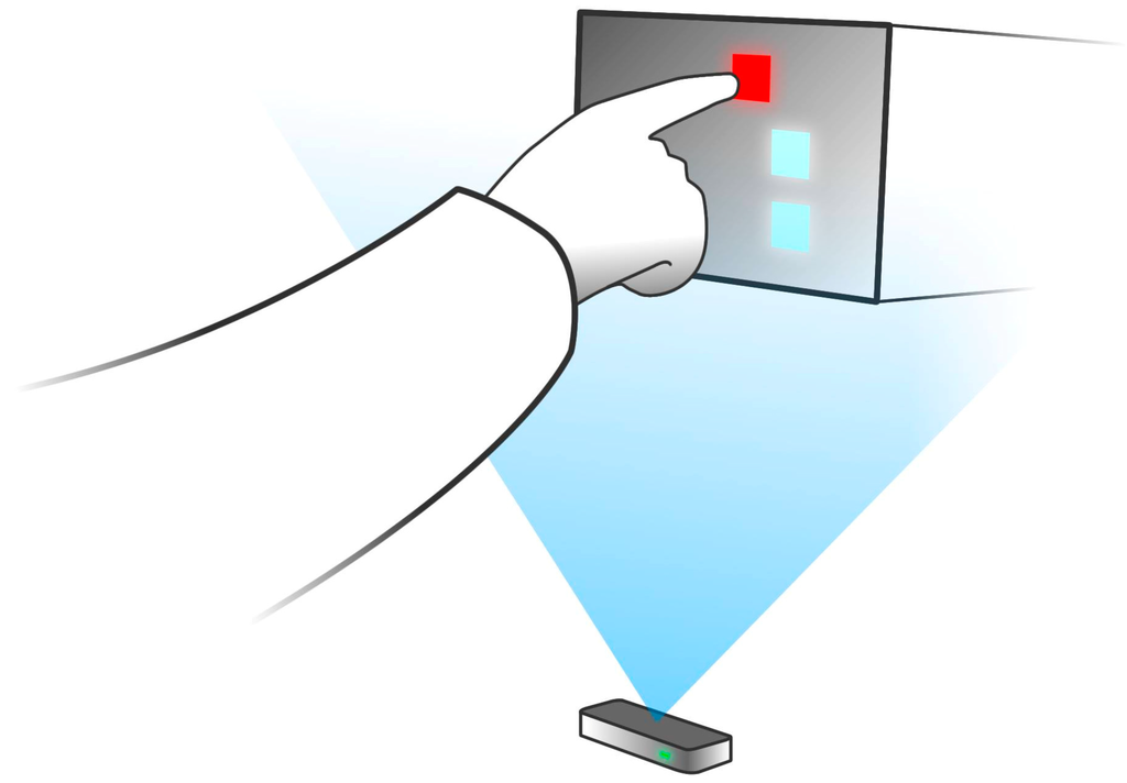 A variety of studies involving Leap Motion Controller have been performed including studies with 3D gestures [17,18,19] and pointing tasks [20,21]. These approaches are based on defining a set of gestures for interaction often involving feedback to the user in the form of virtual pointers in 3D space, which are rendered inside the scene. These pointers guide a user by visually showing the active hand/finger position and the scene for interaction is presented on a normal 2D display.