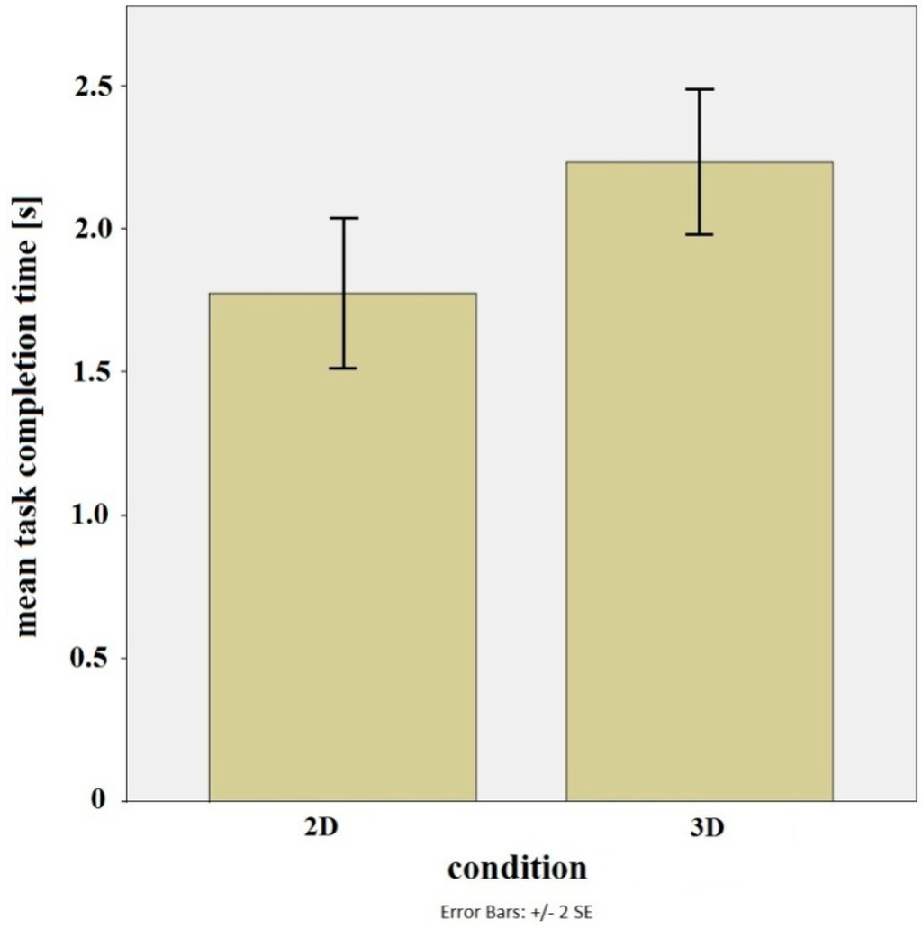 Figure 11 shows mean task completion times for both conditions. The results of the T-test showed the interaction in 3D to be significantly slower than the interaction in 2D (t(22) = 2.521, p = 0.019). This result was expected since the additional dimension implies extra time that is needed to, firstly, cognitively process the visual information and, secondly, to physically locate the object in space.