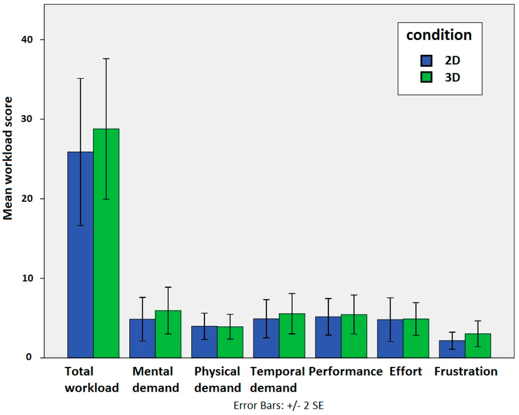 Figure 12 shows mean workload scores for the subscales of the NASA TLX test as well as the overall workload score. The results of the T-test (t(22) = −0.452, p = 0.655) reveal no significant difference in cognitive workload between the conditions.