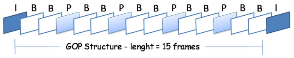 The multipath routing scheme of MMDSR is based on the DSR (Dynamic Source Routing) protocol [12] to find available paths from source to destination. Video is distributed using RTP/RTCP (Real-time Transport Protocol/Real-time Control Protocol) [29] over UDP as transport protocols. Our system uses a layered MPEG-2 VBR coding of the video flow, which is formed by sets of frames, usually 4 to 20 frames, called GoP (Groups of Pictures), see Figure 1. A GoP has three types of frames: I, P and B, and has a unique frame-pattern in a video repeated in each GoP. I (Intra) frames encode spatial redundancy, they form the base layer, provide a basic video quality and carry the most important information for the decoding process at the receiving side. The whole GoP would be lost if the corresponding I frame were not available at decoding time. P (Predicted) and B (Bi-directional) frames carry differential information from preceding (P) or preceding and posterior (B) frames, respectively. Considering these characteristics, we assign different priorities to the video frames according to their importance within the video flow. Therefore, I frames should have the highest priority, P frames the medium priority and B frames the lowest one.