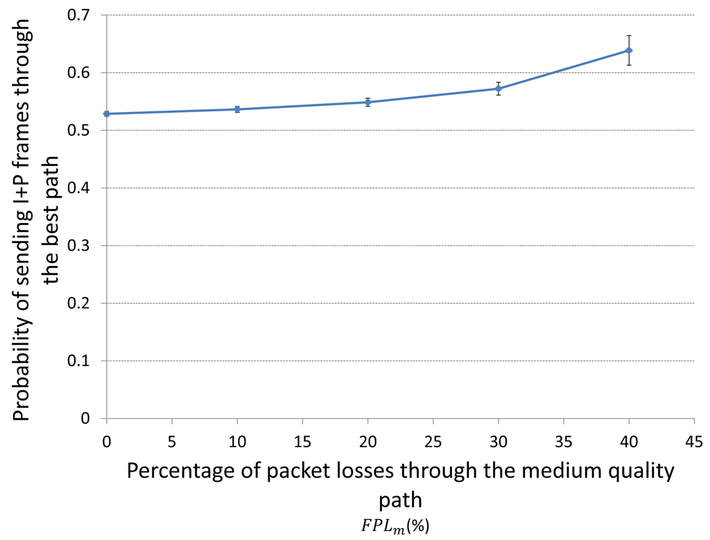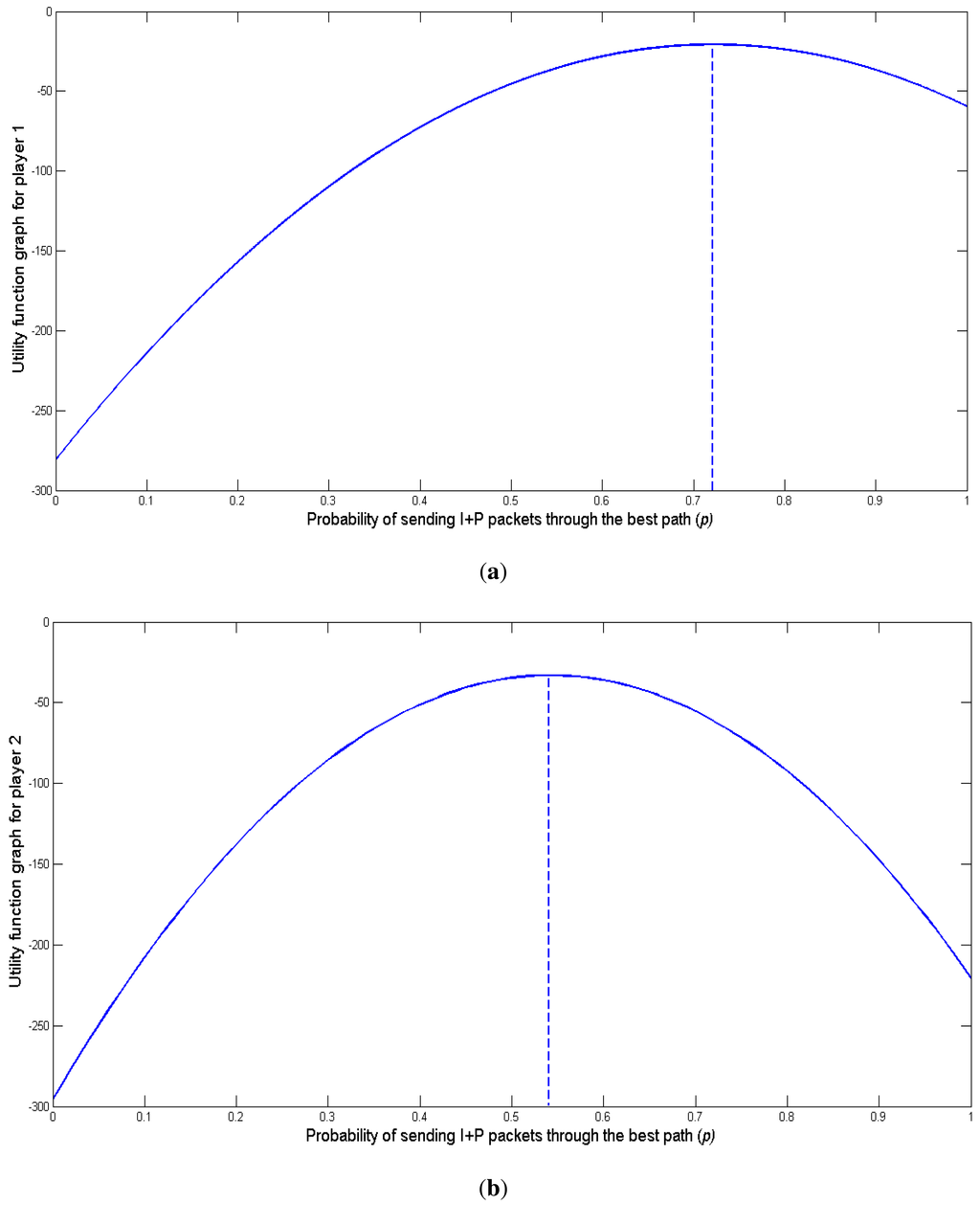 In Equation (14), we have made our utility function Ui to be proportional to the negative of the I+P frames losses. This way, the utility increases as the losses decrease, for both the best and the medium-quality paths. Besides, Ui is a concave function so that we ensure to have a p value that produces the maximum utility. In Equation (14), is the negative of the I+P frame losses through the best path and is the negative of the I+P frame losses through the medium-quality path.