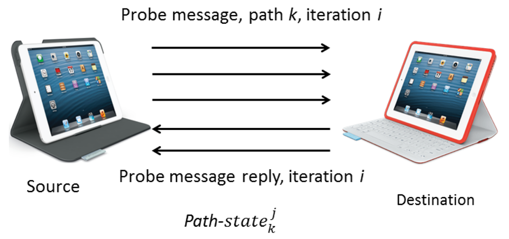 Decisions such as path selection or tuning of configuration parameters are operated from the source. MMDSR periodically discovers AP available paths between source and destination by sending monitoring Probe Message (PM) packets. After that, a Probe Message Reply (PMR) packet is generated at destination to carry the collected information about the quality of the available paths. The reduced size of these packets (around 64 bytes, depending on the number of paths found out) and the low frequency of sending them (every 3–18 s depending on the network state, see Equation (4)) makes the incurred overhead almost negligible. Figure 3 shows PM and PMR packets which are periodically interchanged between source and destination.