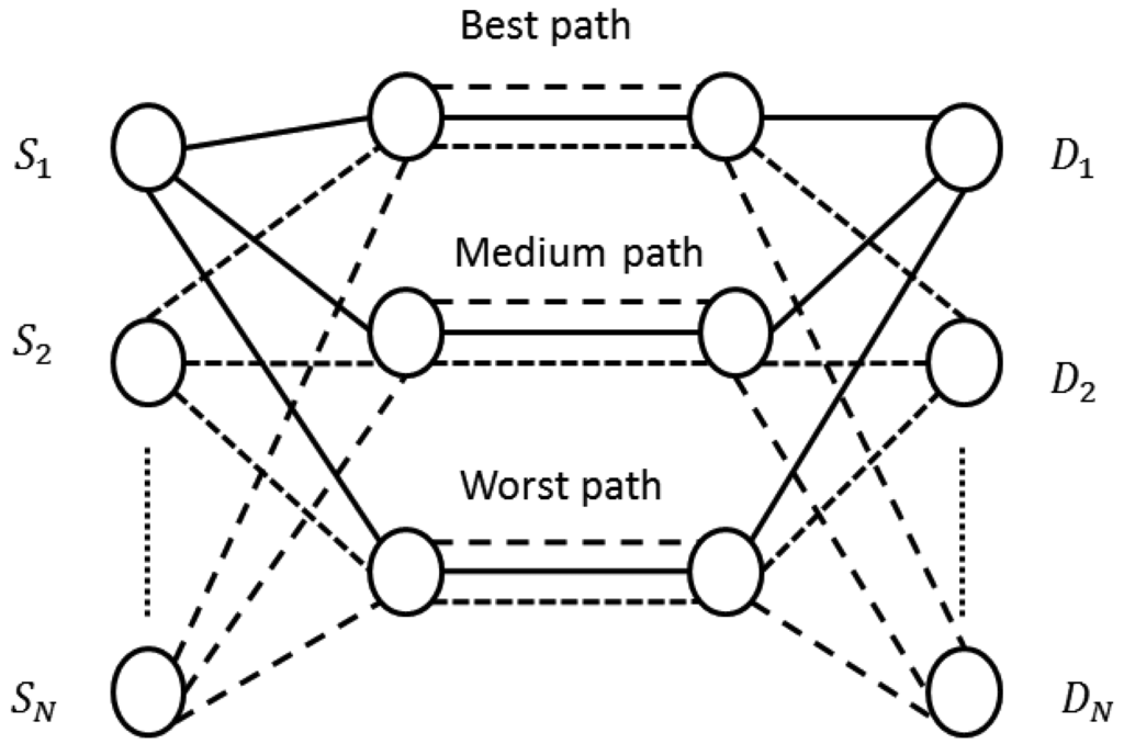 Figure 4 shows the proposed architecture. We assume N connections (S1-D1, S2-D2,…, Sn-Dn) and three paths. It is likewise possible to apply the proposal to any MANET independently of the number of connections, nodes and paths.