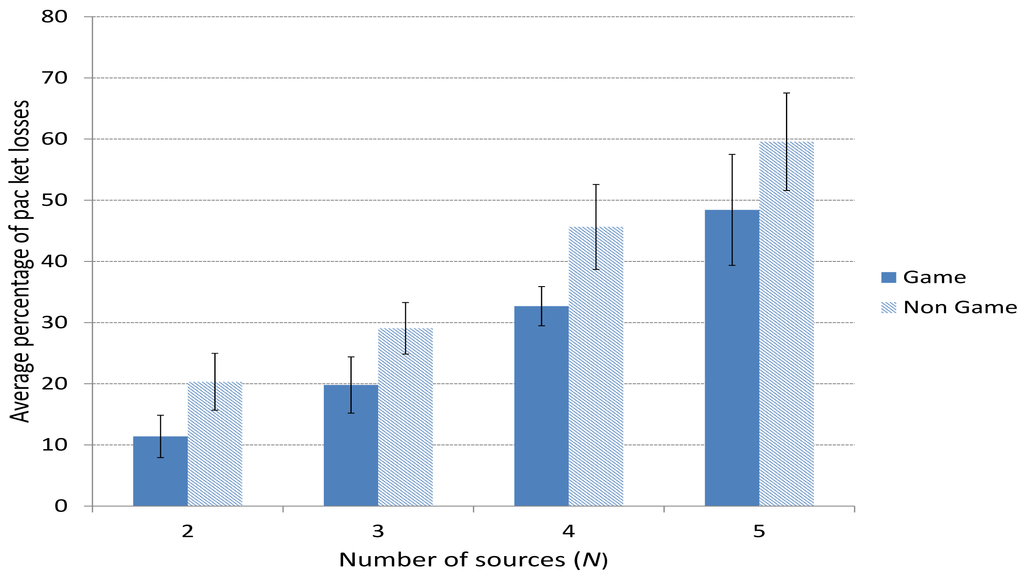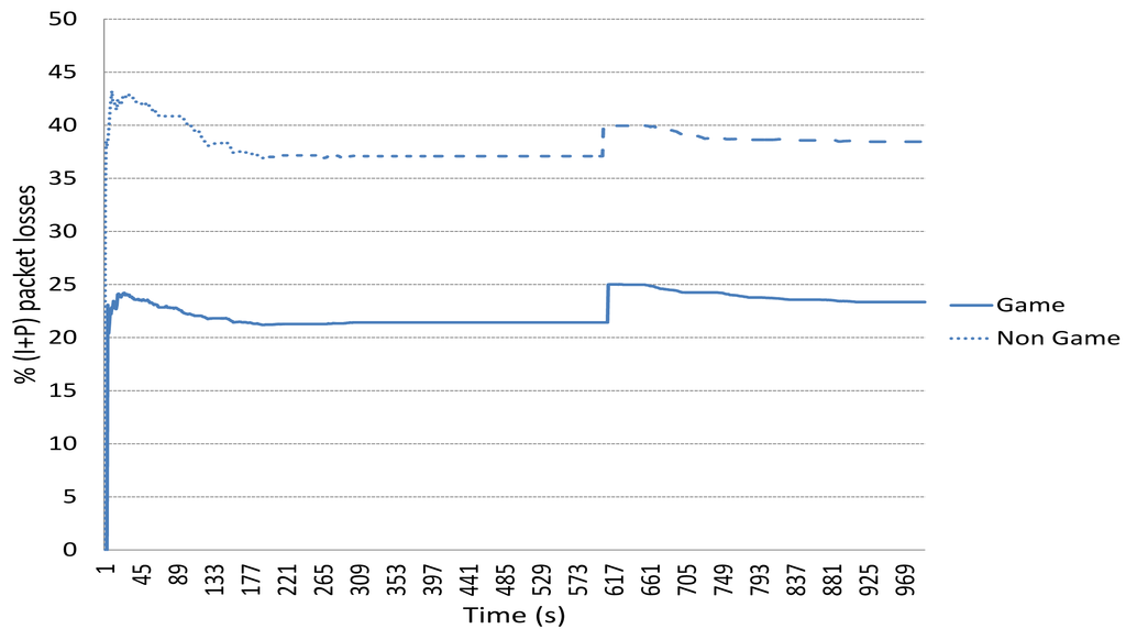 To cope with this issue, users could play a game such that the best two paths (best, medium) could be selected by each player to transmit the most important video frames (i.e., I+P frames). That is, each user could prefer to send sometimes the most important frames through the medium-quality path. Just for simplicity, B frames are considered always to be sent through the third path, which is the worst one. Also, I and P frames belonging to the same video stream are going to be sent through the same path to make more evident the inconveniences of sharing the same path, since there are more P frames than I frames per flow.