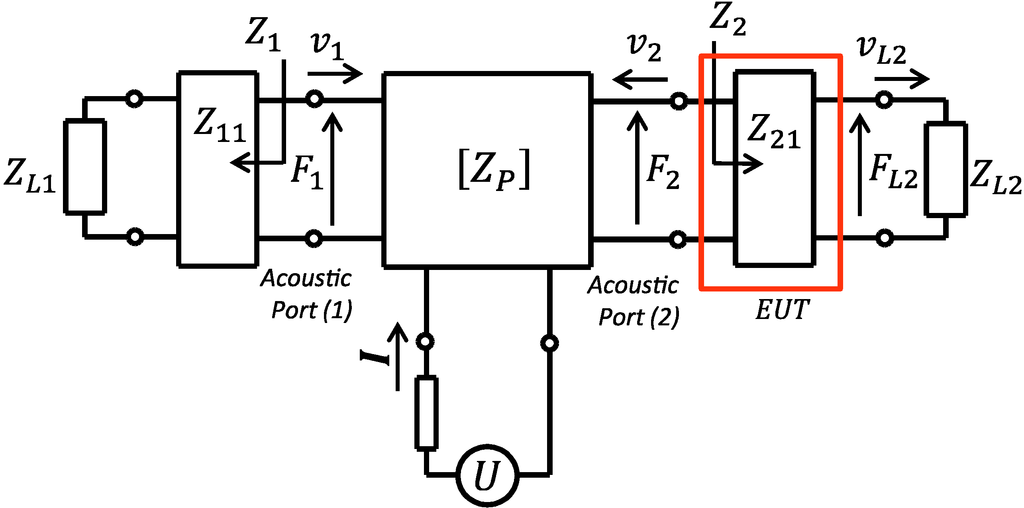 To estimate the effect caused by the acoustic layer, the slabs of acoustic impedance and (at the acoustic terminal ports, see Figure 2) were modeled as a delay line with phase constants in the materials as and , respectively. Determination of or is obtained by impedance transformation of these acoustic layers cascading with the terminated load which can be calculated from the well-known impedance transformation [19]. For instance, in case the acoustic layer at port 2 (EUT) is terminated by air , the equivalent acoustic impedance looking from port 2 of the transducer is: