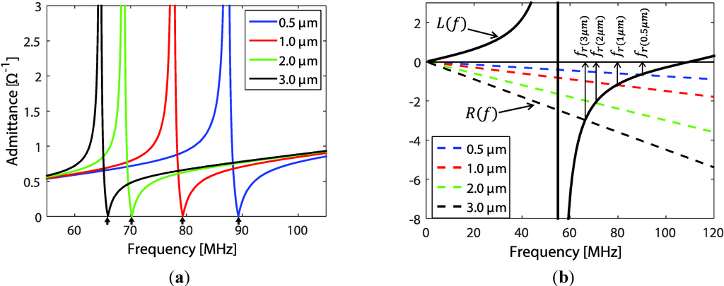 As a simplified illustration, the admittance of stand-alone transducer film (no backing material and ) with varying EUT thickness (which is the layer) is illustrated through resonant frequency shifting. For this case we have (since also neglecting the rear electrode thickness) and is as in Equation (1). Assuming no loss in the piezoelectric film, using the expression of and for Equation (7) together with the material constants in Table 1, the plot of the admittances is shown in Figure 3a. A shift in resonance frequency (indicated by lower arrows) is observed and represents the behavior of the transducer admittance response to variations. Alternately, with the resonant condition, and , the denominator of the rear term in the parenthesis of Equation (7) equals zero. For and using trigonometry identities, the denominator term can be rewritten as: