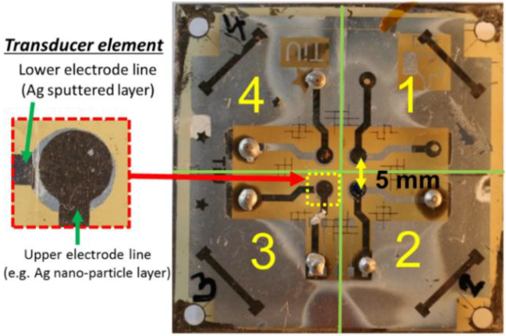 In order to crystalize the piezoelectric film, the sample was annealed at a temperature of 130 °C for 6 h. After annealing, the P(VDF-TrFe) surface was treated with plasma. The last transducer layer is a front electrode (EUT) made from Ag nano-particle ink (ALDRICH/719048) provided by Sigma Aldrich (St. Louis, MO, USA). The layer was implemented by spinning the ink on the piezoelectric film, which afterwards was sintered at the temperature of 130 °C for 1 h to enable the conductivity of the layer. To create a thicker EUT layer, the layer was repeatedly spun with the ink. To be able to make several different thicknesses on the same substrate, some areas were covered with tape which allows selective-thickness deposition of the ink on the substrate. For instance, to produce several different thickness layers, we first deposit ink covering the whole upper-side of the copolymer layer after annealing, then for the second ink deposition layer, area 1 was taped allowing ink to cover only areas 2, 3 and 4 (see Figure 4). Using the same approach, one can create the remaining layers. After that the layer was patterned to achieve an electrode diameter of 2.5 mm (by a similar process as described for patterning the rear electrode). Figure 4 also shows the transducer substrate which contains four transducer elements with an element pitch of 5 mm. In between the processing steps, the Ag nano-particle ink thickness was also measured using our KLA/Tencor P6 surface profiler. This instrument was also used to measure the rms surface roughness, typically ranging from 0.09 to 0.24 µm on the top of the transducer aperture.