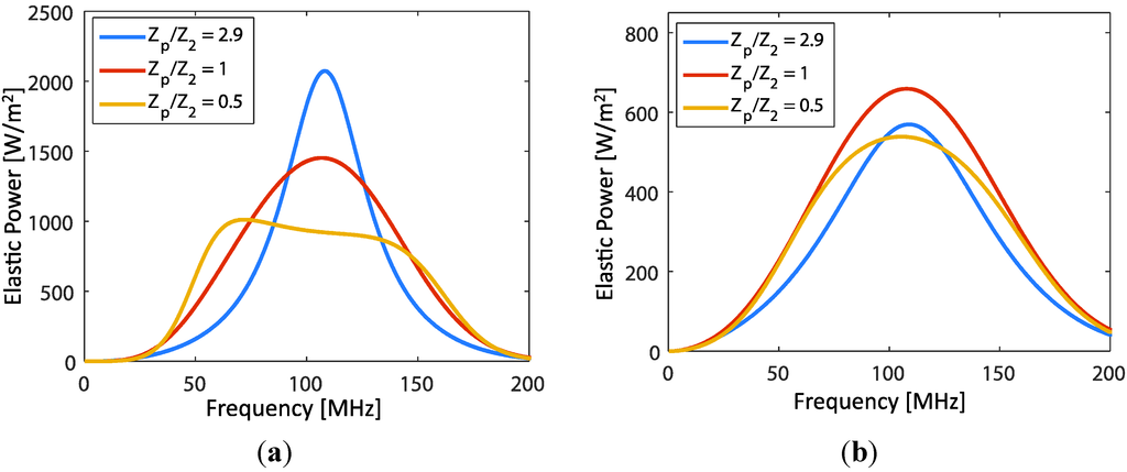 In this section we present results of the study in the Section 3. Initially, two different configurations of the transducer (no backing material and with polymer backing) were studied. In the model, we assume that EUT layer thickness was negligible. We used the material constants and loss factors as shown in Table 1. With front load variations (in this case ), the transmitted acoustic power (TAPF) per unit area frequency response was determined by dividing Equation (3) by . Figure 6a shows the influence of the front load variation on the TAPF of the transducer with no backing material (therefore air). The variations are expressed in term of . The transducer produces the same trend as in Section 1.4.1 of [20] (higher impedance ratios yield higher magnitude, but narrower bandwidth). However, in the polymer backing case (Figure 6b), the response characteristics are different. The peak magnitude is accompanied by a broad bandwidth when (matched impedance). The widest bandwidth occurs when . In this case, marginal difference of the magnitude, also the bandwidth, among the impedance ratios of 0.5, 2.9 and 1 are observed. Comparing the results of two transducers, the TAPF characteristics vary significantly. For instance, when loaded by water , the transmitted power magnitude and the bandwidth of air backing and polymer backing transducer are with 44 MHz, and with 81 MHz, respectively. Thus, to obtain a large signal bandwidth, the backing substrate is important, but at the cost of decreasing the transducer sensitivity.
