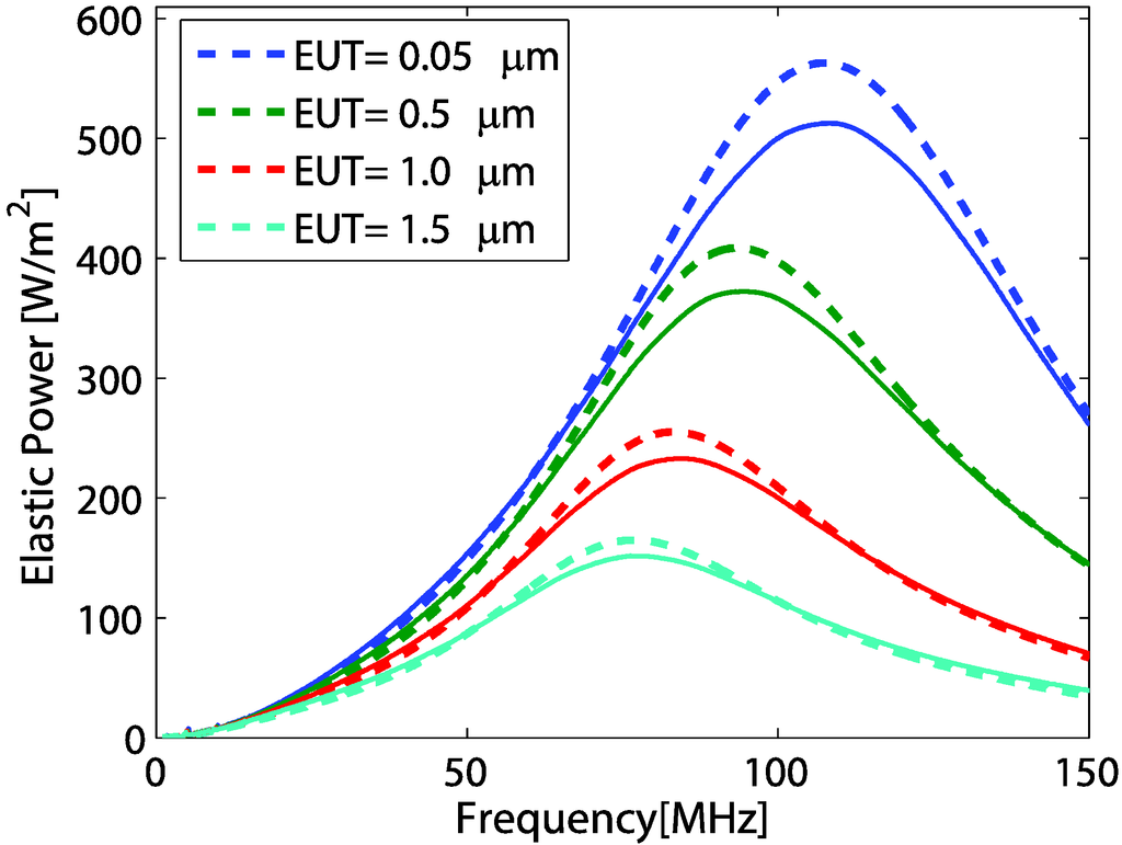 In the figure, results from numerical modeling by COMSOL simulation software are also plotted. Variations of TAPF characteristic, influenced by thickness variation, are depicted in Table 2. Here, we notice that the magnitude of acoustic power, the peak frequency and the 3dB bandwidth decreased with increases in the EUT thickness. Thicker EUT layers act as energy band pass filters with more effects at higher frequencies (right part). The thicker layer provides a higher conductivity, but will cause the reduction of bandwidth with down-shift in frequency peak magnitude. Similar effects, but resulting from the sputtered electrode transducers were also experimentally observed in [9].