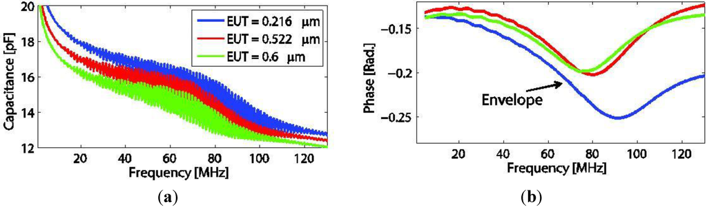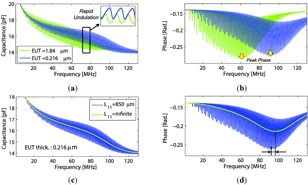 A rapid undulation occurs in both capacitance and phase in a same way as seen in Section 7.2.1, but for the phase, the data were processed to only plot the envelope. From both figures, the capacitance pattern of the measurement and its responding phase peak shift is inversely proportional to the EUT thickness value.