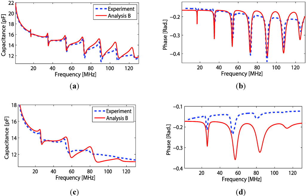 Comparison of analytical and experimental data for a transducer using a PI-backing substrate with a back side sputtered electrode. The figures show (a) capacitance and (b) phase with a Ag-sputtered front electrode and a 50 μm PI backing. Figures (c) and (d) show corresponding results using a 25 μm PI-backing substrate and a Ag-nano particle ink front electrode.