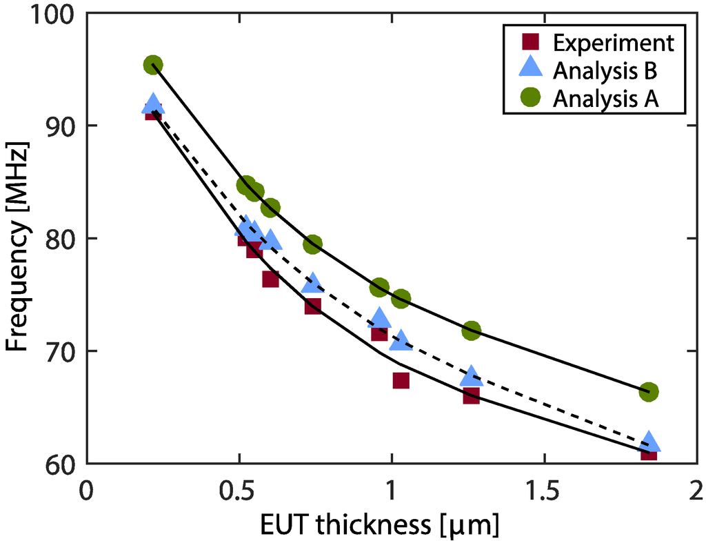 Plots of peak phase frequency versus EUT thickness are shown in the Figure 11. The figure shows a comparison of the analysis A determined from Equation (7) with the condition of infinite backing length , analysis B determined from Equation (7) with the actual backing length (850 μm) and the experimental data. Considering the analysis data, as we see for a thin EUT layer, the peak phase frequency changes dramatically for the variation of thin EUT layer and slows down as the EUT layer become thicker. Similar properties were observed in the case of air backing (Section 4.2). Experimental data show the same tendency as analysis B even though some values are disparate. Also, the experimental data are not smoothly sorted. A plausible explanation is that it results from variations of the thickness of piezoelectric film (i.e., errors from film manufacturing) which yield different transducer resonant frequencies. All experimental data have a lower frequency value (compared to Analysis B) for each EUT thickness. Also comparing different backing thicknesses (Analysis A and B), the infinite backing transducer yields a higher phase peak frequency for each EUT thickness.