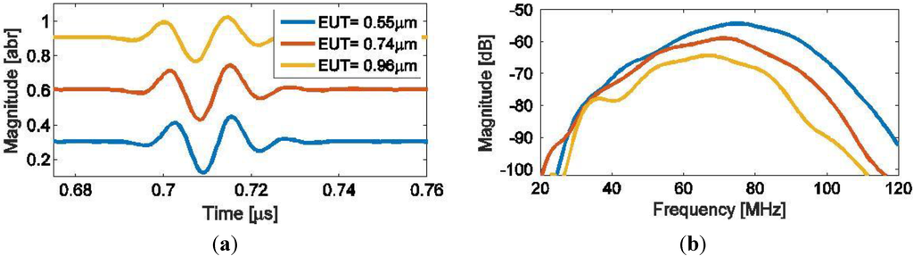 Measured acoustic responses for three transducers with different EUT thicknesses. Here the pulses are shown in time-domain (a) with a small DC value added for separation, and the corresponding frequency spectrum of the signals (b).