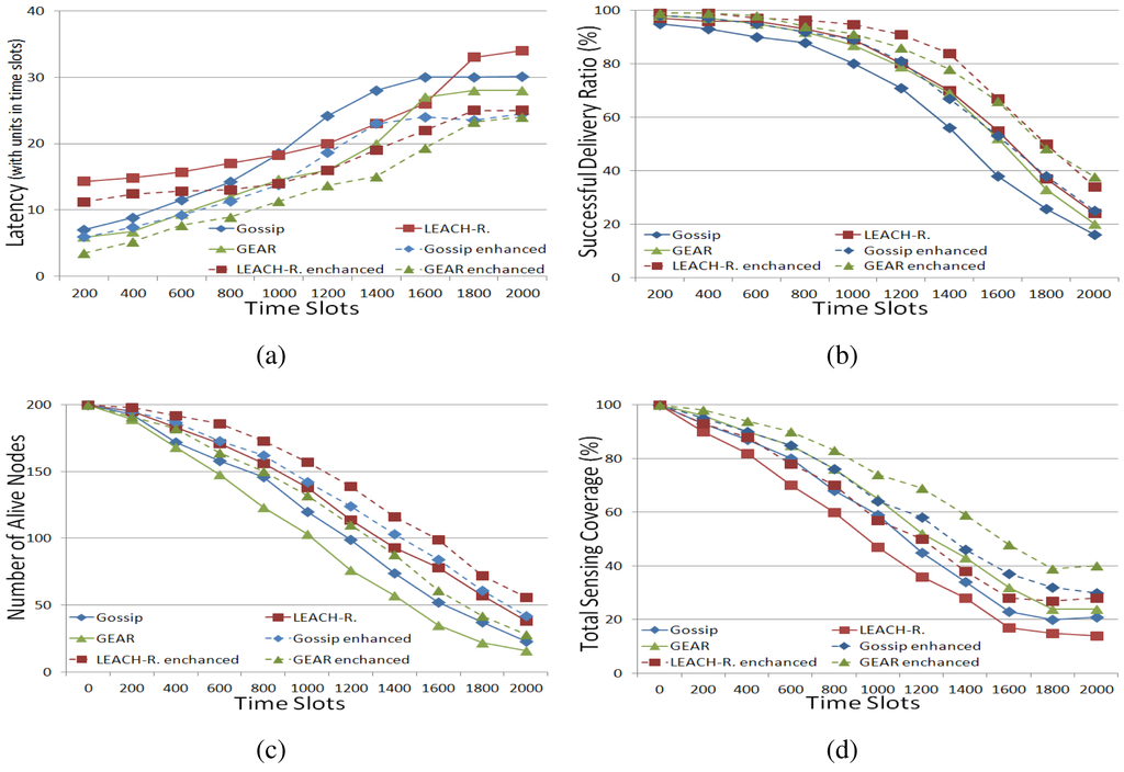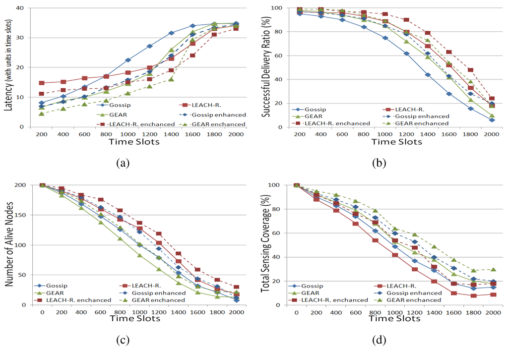 In Figure 2a, initially, the delivery latency values in gossiping and GEAR are less than that in LEACH-revised. However, as time progresses, LEACH-revised turns out to be better than both gossiping and GEAR. This can be explained as follows. Initially, in LEACH-revised, the cluster heads usually have to wait for a period for their cluster members to send packets to them and then aggregate and condense these packets to save transmission energy consumption. As time progresses, some sensor nodes are depleted. In gossiping and GEAR, some pre-existing routing paths will disappear, but in LEACH-revised, the impact, caused by sensor node failure, is much less than that in gossiping and GEAR, because routing in LEACH-revised is based on only a few nodes, i.e., cluster heads, and even if these cluster heads are exhausted, some other nodes can take their roles immediately by taking the measure developed in LEACH.