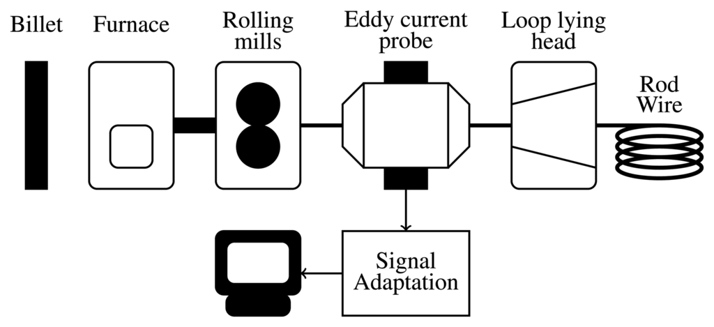 Wire rods are an intermediate steel product of approximately a round solid cross section that is wound into coils and transported in this form. It is primarily used for subsequent drawing and finishing by wire drawers and is ultimately used to manufacture a variety of products, including electric welded chains, cold-drawn bars, springs, nails, reinforcing wire mesh, chain link fence and many different types of wires. Bar and wire rods are produced by hot rolling, and surface defects can appear on rods during the manufacturing process. These defects can be detected by an eddy current inspection system.