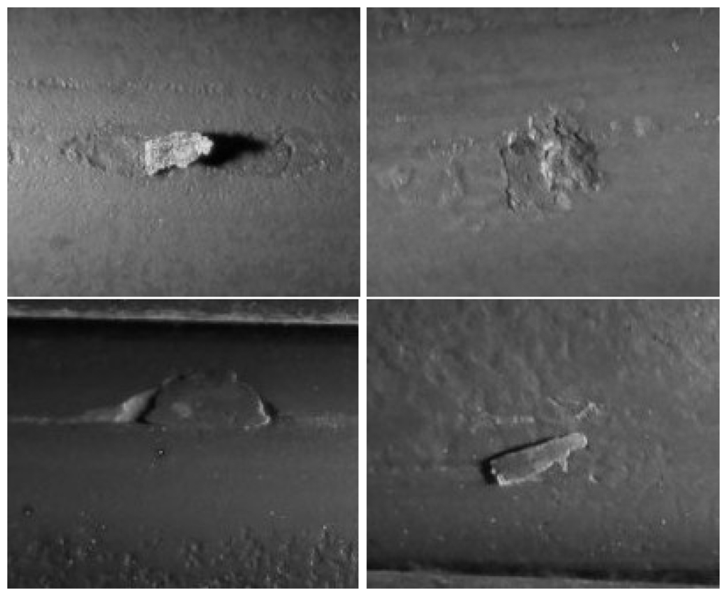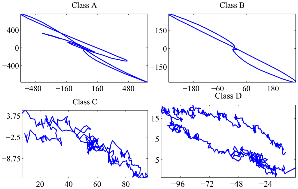 The operators of a manufacturing plant of wire rods identified and labeled the surface defects obtained for several production shifts. This has been a very tedious and time-consuming task, because it required unwinding long wire rod coils, searching the surface defects by visual inspection and classifying and putting them in correspondence with the signal recorded by the eddy current inspection system. After this manual process, a collection of labeled defects is available for validation of the developed unsupervised classification method. The surface defects have been classified by the experts into four different classes. The corresponding eddy current signals associated with them have been represented in the complex impedance plane and labeled as defects belonging to Classes A, B, C and D, respectively. An individual sequence representing each of these groups is depicted in Figure 2. The length of the available labeled sequences ranges between 101 and 996 samples. Samples of the defect classes are shown in Figure 3.
