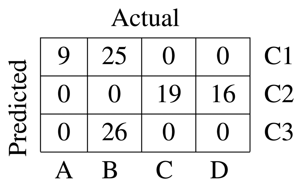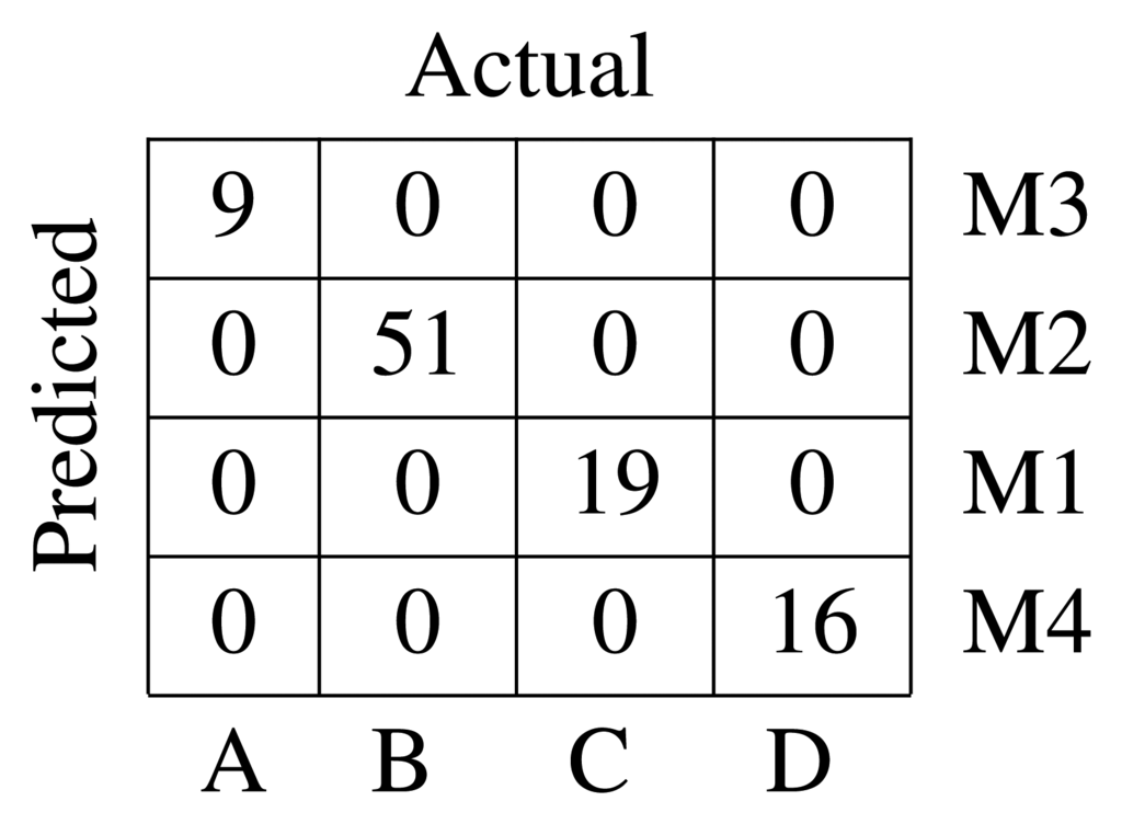 The labels assigned by the clustering algorithm are arbitrary. Looking at the resulting medoids, it is evident that Medoid 1 correspond to Class C, Medoid 2 to Class B, Medoid 3 to Class A and Medoid 4 to Class D. It is possible to rearrange the label names and compute a confusion matrix. The confusion matrix is shown in Figure 7. It can be seen that the unsupervised classifier is capable of gathering in the same cluster all pf the defects belonging to the same class with no error.