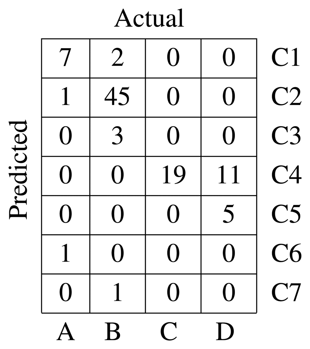 The confusion matrix shown in Figure 5 summarizes the results. Seven clusters have been found, but two of them are negligible, because they contain only one element. Defects in Classes A and B are mainly assigned to Clusters C1 and C2, respectively. Defects in Class C are assigned to Cluster C4. Most of the defects in Class D are also assigned to Cluster C4. Only five defects from this class are assigned to Cluster C5. The value of the silhouette index is