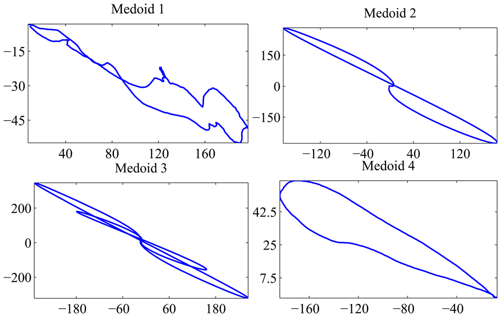 Four classes are found, and their medoids are depicted in Figure 6. Medoid 1 has only one lobe spreading across the right side of the complex impedance plane. Medoid 2 has two lobes in the first and third quadrant. Medoid 3 exhibits more than two lobes in the same quadrants. Finally, Medoid 4 has only one lobe in the left side of the impedance plane. The medoid shapes agree with the representative elements of each defect class shown in Figure 2. The global silhouette index is