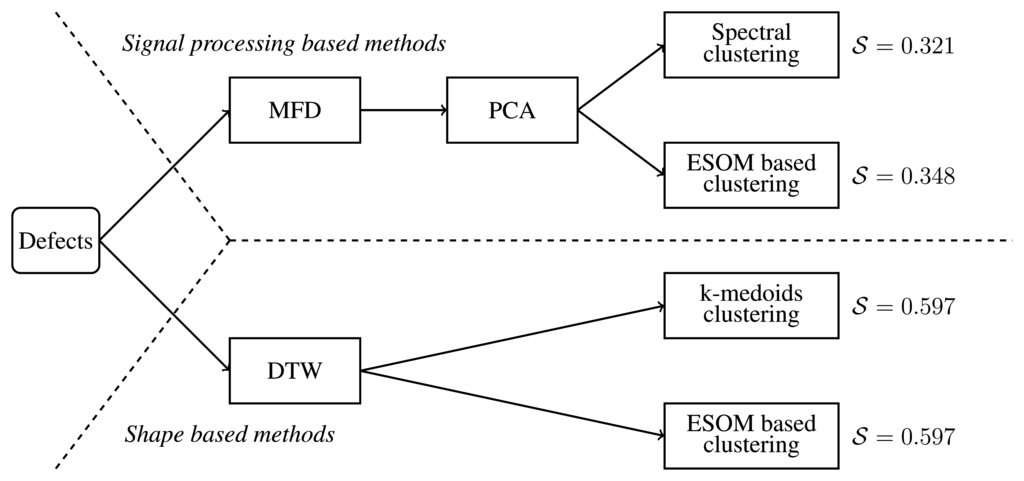 Unsupervised classification using the MFD is accomplished in two steps. The first one consists of computing the MDF for every defect according to Equation (8). In the second step, a clustering algorithm is applied to the MFD obtained in the first step.