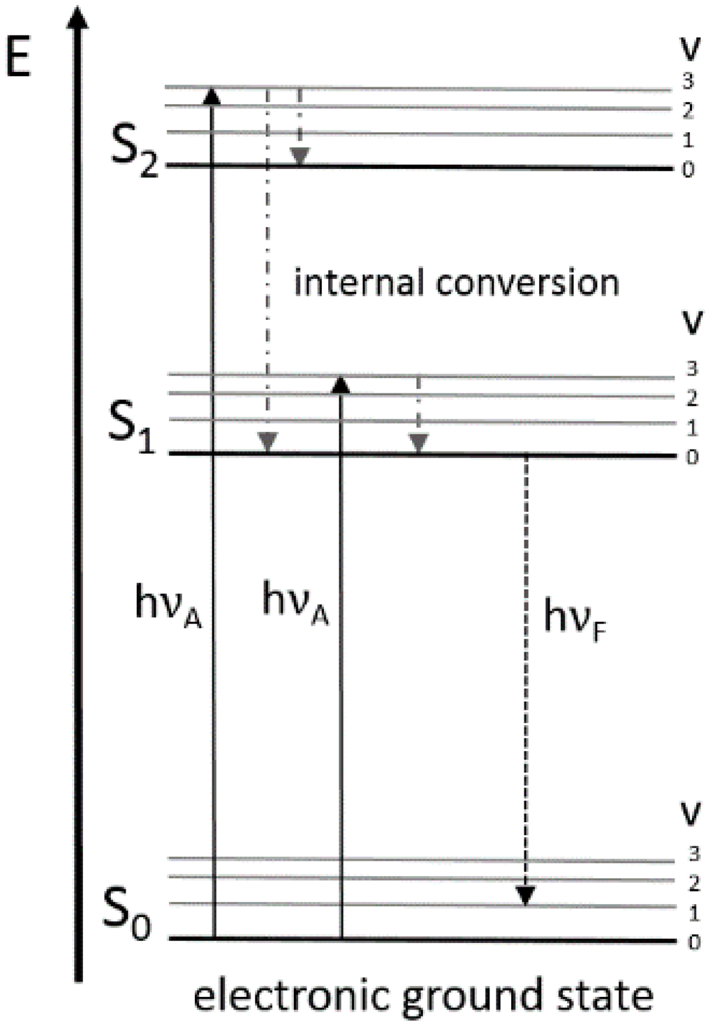 Energy level diagram (Jablonski diagram) for visualization of fluorescence phenomena (see explanation in the text).