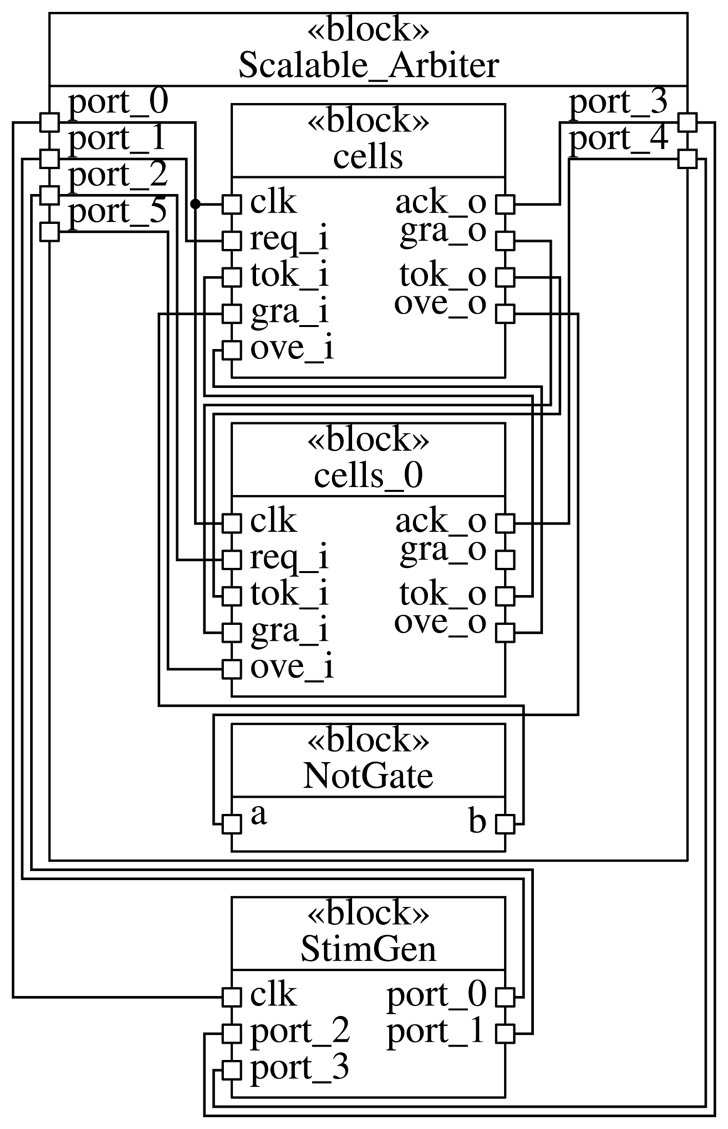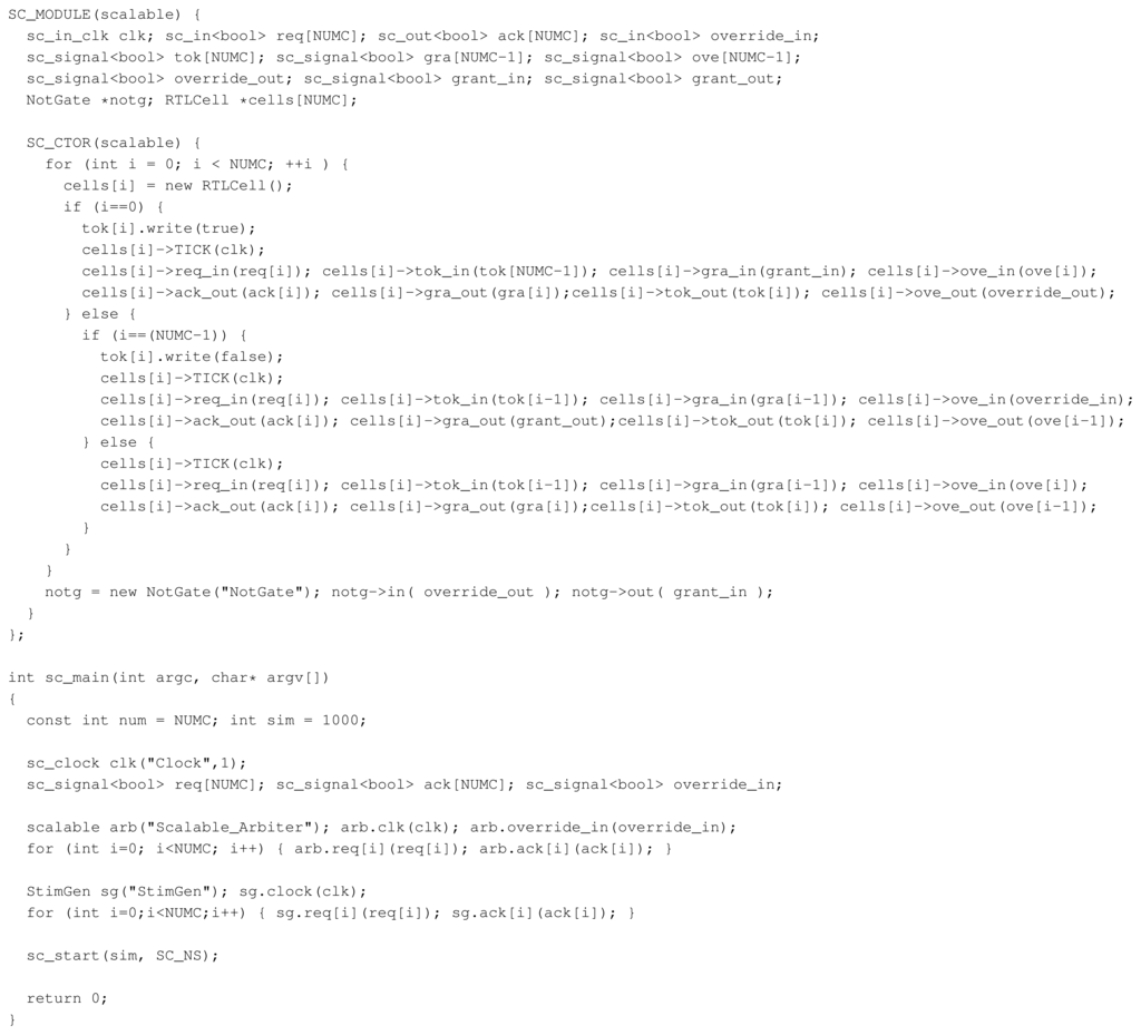However, while the static parsing approach works well for designs that describe one single, static system, this approach has some serious drawbacks when it comes to more dynamic structures, such as, e.g., parametrized designs that rely on user input. Parsers, by definition, do not execute a given system. This quickly becomes a problem when taking SystemC's notion of design setup into account where the design itself is created by executing the according C++ code during the elaboration phase. Structures may be created by simply lining up calls to module constructors, which can easily be parsed. However, elaborate designs can be written by creating structures in loops or recursions, creating many instances with just a few lines of code. Creation can also be hidden within macros or other code elements that may or may not be active depending on how the compiler's preprocessor modifies the code. A design may even be created using, e.g., user-defined input values, letting the designer specify, e.g., the number of cores of a simulated CPU or the amount of cache available to a system before running the executable. While complex static structures, such as nested loops, preprocessor directives and compiler-specific language modifications, represent technical issues (i.e., it is hard, but conceptually possible to parse these), parsers are conceptually limited to a purely static approach and, thus, unable to retrieve the correct information if the design relies on information that is not known before executing it. Concerning the example given in Figure 1, this means that parsers will have difficulties analyzing the structure of the arbiter, as the amount of cells within the module might not be fixed. Furthermore, the structure within the module is created using several loops, requiring the parser to go beyond a purely static analysis and, e.g., to execute parts of the code or unroll the loops to extract a model of the design.