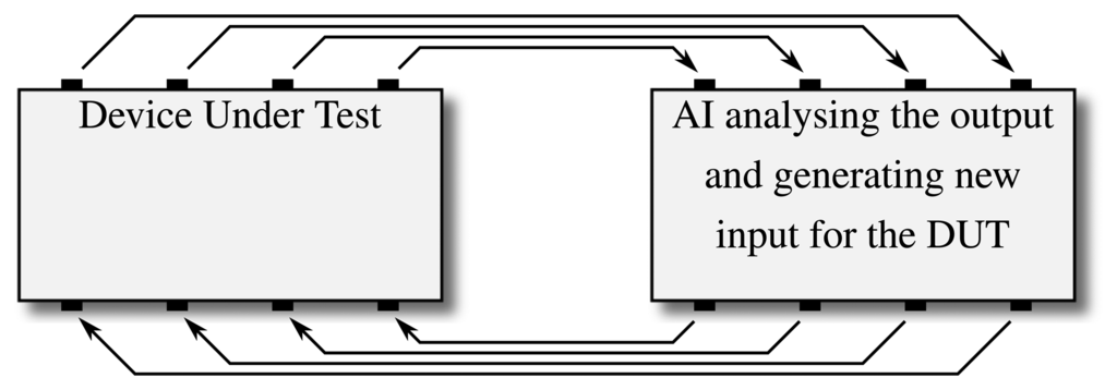 A variety of algorithms were implemented to generate test patterns for the simulation phase of a SystemC design. While only a few of them focus on SystemC in particular, the approach of having an algorithm watch the execution is usually portable, allowing for algorithms to be easily adopted to an application on the ESL. The basic function of these approaches is the same throughout: as illustrated in Figure 6, CDG attempts to create a feedback loop where an artificial intelligence analyzes a system's behavior and uses this data to generate stimuli to more quickly achieve a certain coverage goal []. Different algorithms have been applied for the step of learning the given system's details. Most works focused on evolutionary algorithms (e.g., [,]) or probabilistic models, such as Bayesian Networks or Markov Models (e.g., [,]), to learn about the underlying system and generate the according test patterns. The former relies on evolutionary methods to optimize a set of individuals against a certain fitness criterion, which usually corresponds nicely to a given coverage value: individuals (corresponding to a certain set of stimuli) that have already gained better coverage are the ones that are used to generate the next generation of individuals, while those with worse coverage are removed from the pool. The latter relies on probabilistic connections between nodes in directed graphs, modeling the probabilities of how a system changes its state as labels for transitions between a graph's nodes.