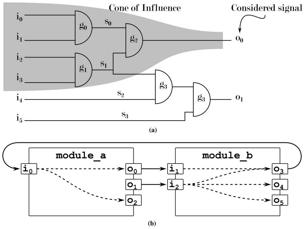 In [], we proposed a design understanding approach by using an AI to extract the cone of influence of modules that are otherwise regarded as black boxes. In hardware design, the cone of influence describes how signals influence each other. Based on the visual metaphor of a cone, starting from its tip (a single signal to be observed), a widening cone is drawn through the system, as in Figure 7, encompassing more and more signals with growing distance to the tip that are either responsible or possibly influenced by this signal. These dependencies between signals can, e.g., be used to determine the origin of an erroneous signal by tracing the signal connections towards the input of a chip.