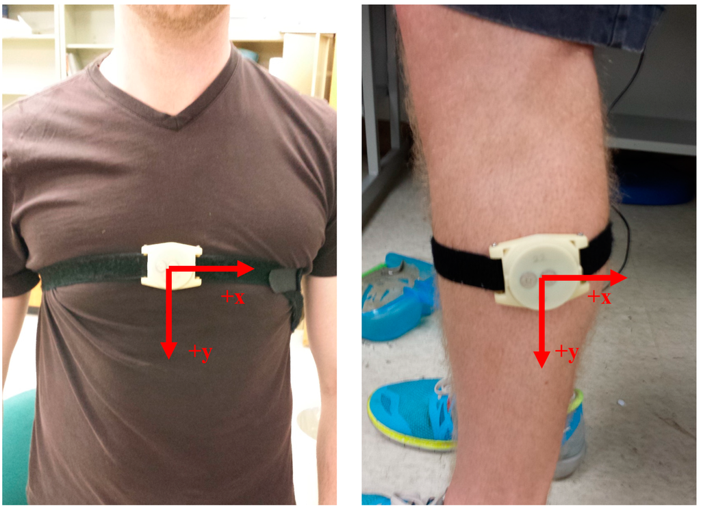 Example placement of the IMU’s: over the sternum and laterally on the mid-shank. Each IMU was oriented using a left-hand coordinate system.