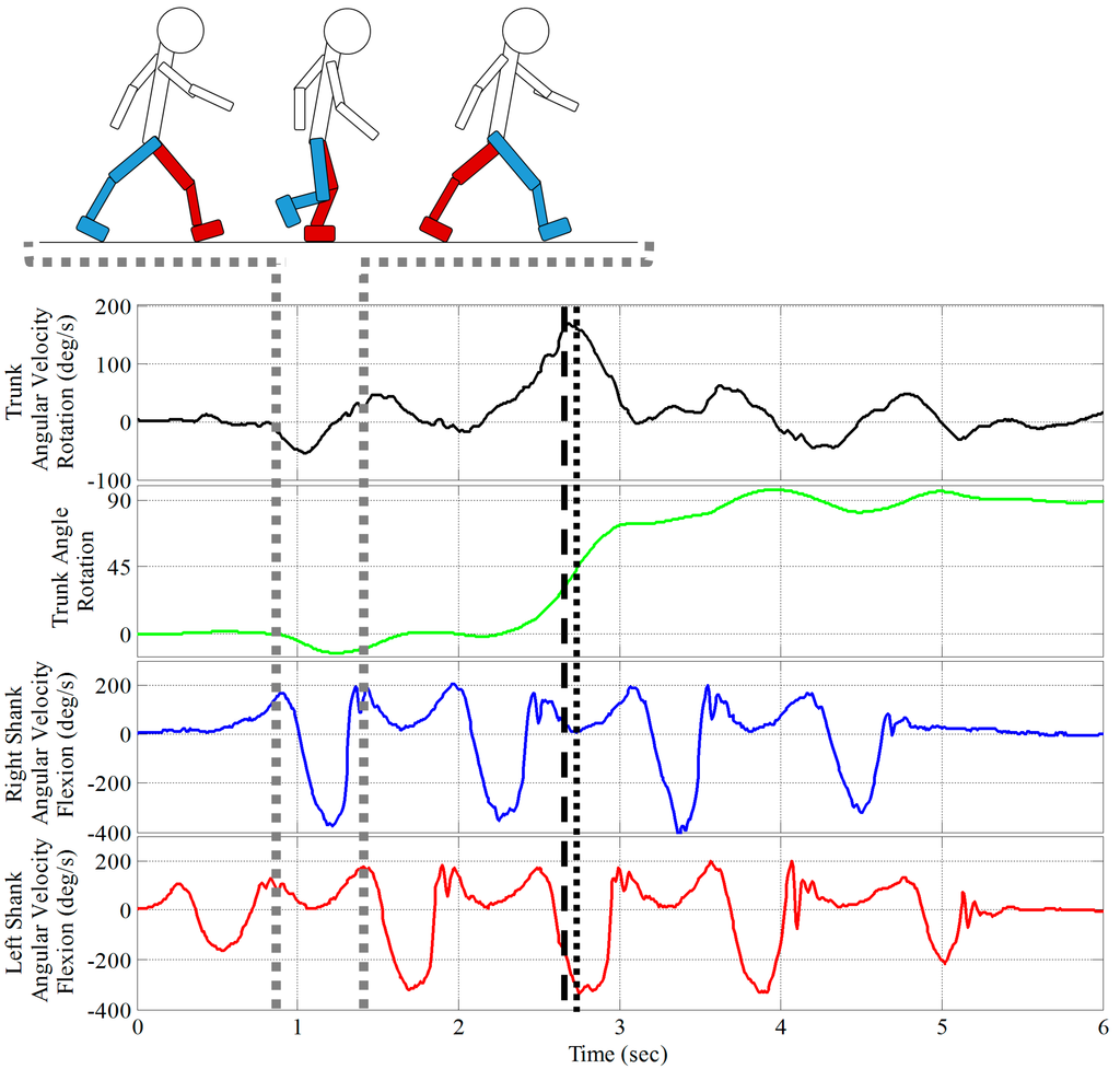 Trunk (top, black), right shank (middle, blue), and left shank (bottom, red) angular velocities during a step turn to the left. The trunk angle obtained by integrating the trunk angular velocity is shown in green. The black dashed line indicates the peak trunk angular velocity (PM). The black dotted line indicated the time when the participant turned 45° (IM). Both times occur during the stance phase for the right foot and the swing phase for the left foot, indicating a step turn. The small oscillations before and after the peak trunk angular velocity represent steps before and after the turn.
