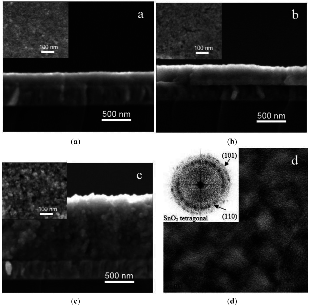 The morphology of films electrodeposited with different charge densities, i.e., 0.2, 0.4 and 0.8 C·cm−2 is revealed through typical SEM images shown in Figure 1a–c. The film thickness, determined from cross-sectional SEM images, increases linearly with the charge density. The thicknesses are 220 ± 20, 380 ± 20 and 940 ± 50 nm, corresponding to charge densities of 0.2, 0.4, and 0.8 C·cm−2, respectively. The top view images (inset) present a porous surface composed of numerous circular nanoparticles. The particle size does not change significantly going from 5 to 20 nm, when increasing the charge density from 0.2 to 0.8 C·cm−2. Due to the difficulty of observing and measuring efficiently the pore size from SEM images, the morphology of the films is further characterized by TEM observation. As expected, the cross-section bright field HRTEM micrograph reveals much better the local porous structure of the film with highly dispersed SnO2 nanoparticles (Figure 1d). It shows many nanocrystallites with clear lattice fringes corresponding to tetragonal SnO2. The average pore size is approximately 10 nm. Besides, the corresponding selected area electron diffraction (SAED) pattern (inset Figure 1d) exhibits two hollow diffraction rings corresponding to the (110) and (101) of tetragonal SnO2. The hollow rings reveal a quasi-amorphous microstructure of the nanoporous film which was also confirmed by grazing incidence angle XRD.